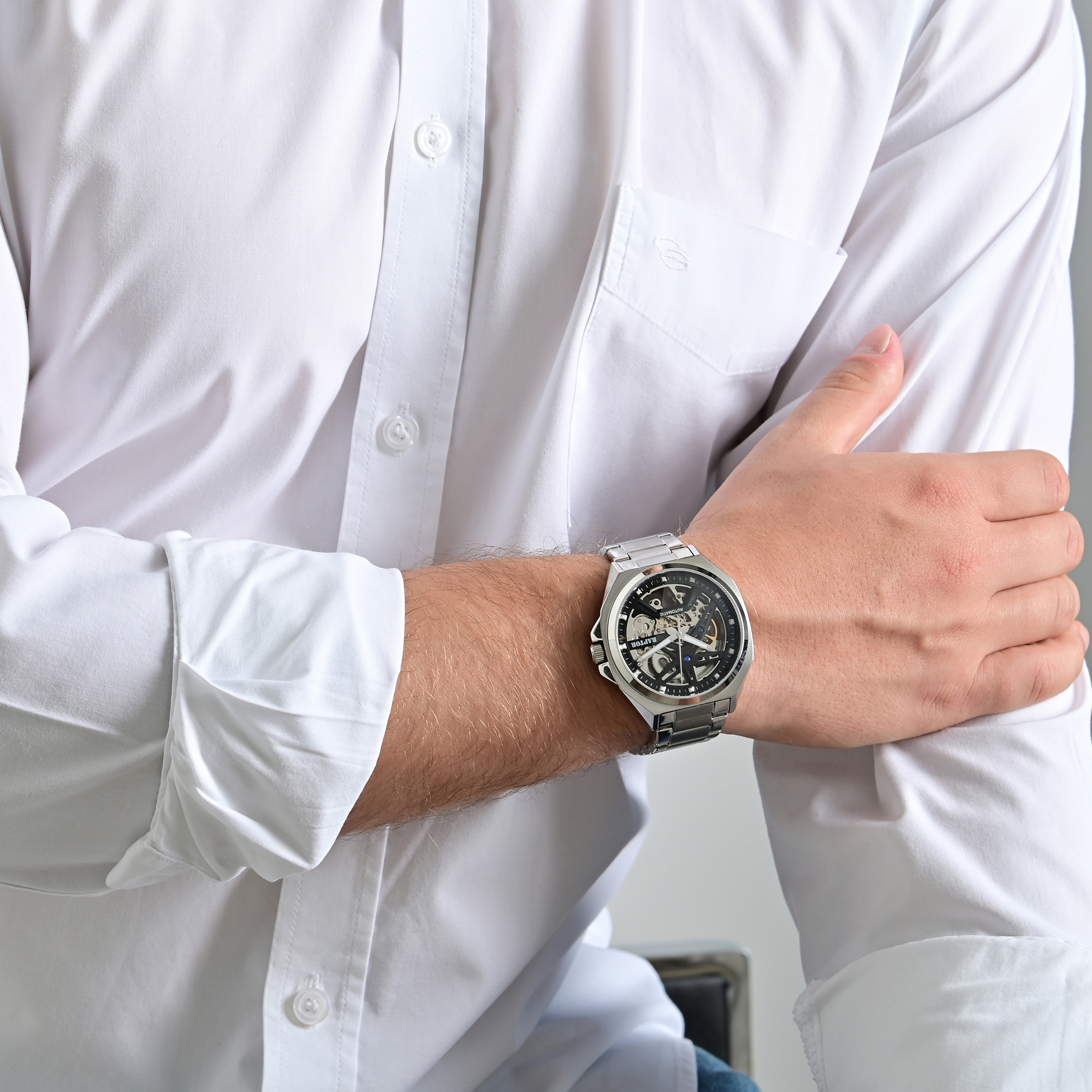 "Arthur" van Raptor is meer dan alleen een horloge - het is een statement voor stijlbewuste mannen die elegantie en technologie waarderen. De wijzerplaat biedt een fascinerend inzicht in het hoogwaardige automatische uurwerk G3265ZH. Er zijn twee decoratieve blauwe stenen op de brug van het uurwerk, die de verfijnde mechanica benadrukken.