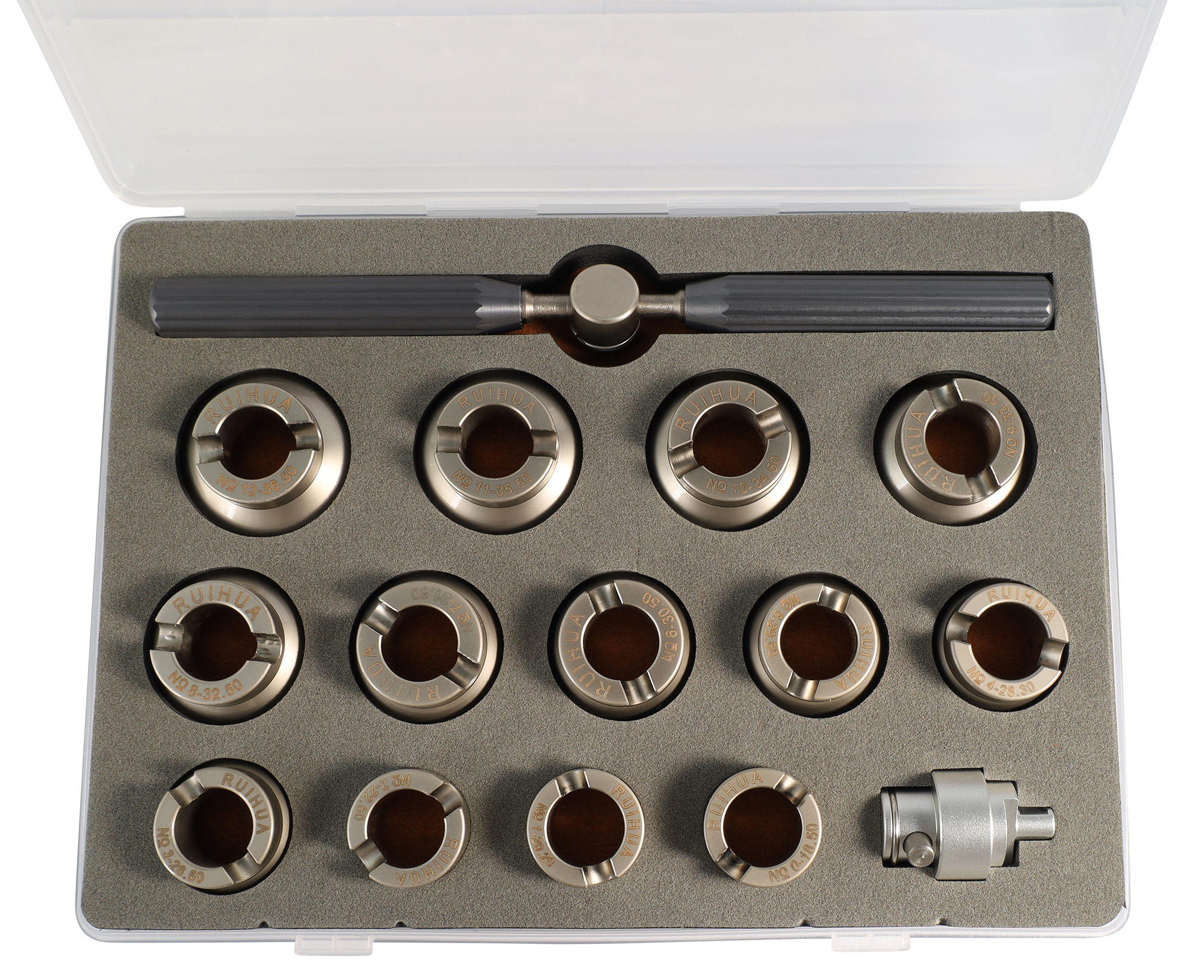 RLX kofferopeners en opzetstukken zijn gemaakt van stevig metaal (001) of robuust roestvrij staal (002, 003). Elke set bestaat uit een kofferopener, een adapter en 13 bijpassende opzetstukken in verschillende maten. De kofferopener zelf heeft een lengte van 20 cm, de maten van de beschikbare opzetstukken zijn hetzelfde in elk van de sets: