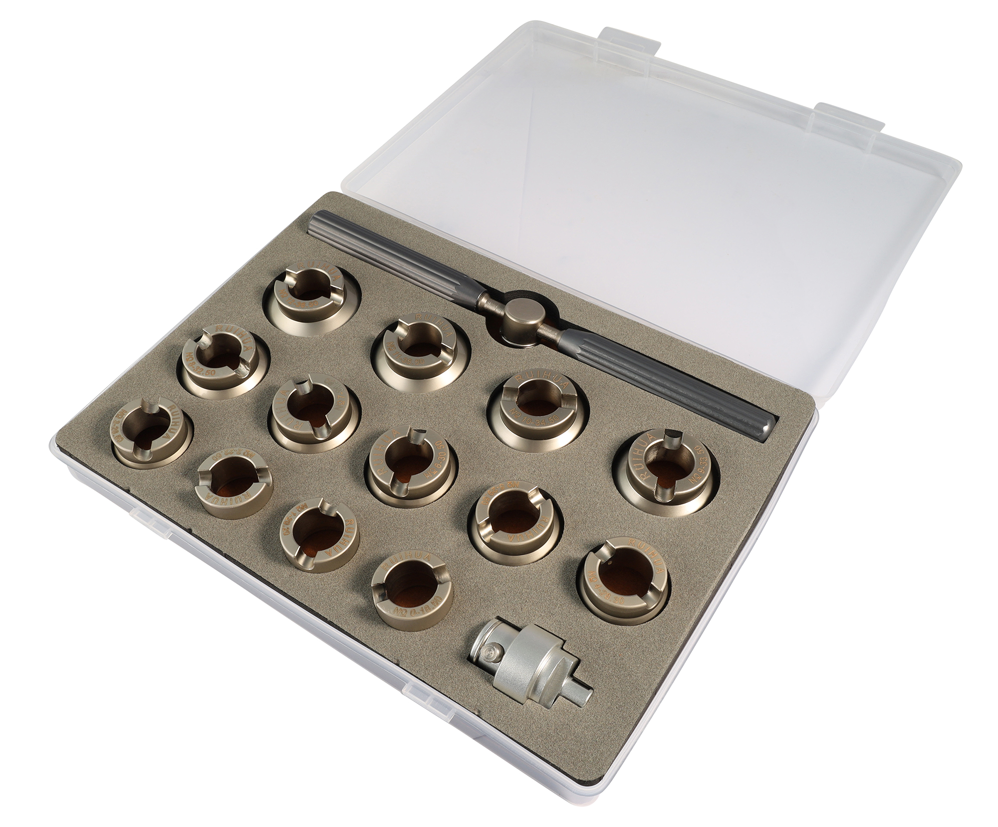 Een robuuste kofferopener met een grote keuze aan opzetstukken.
