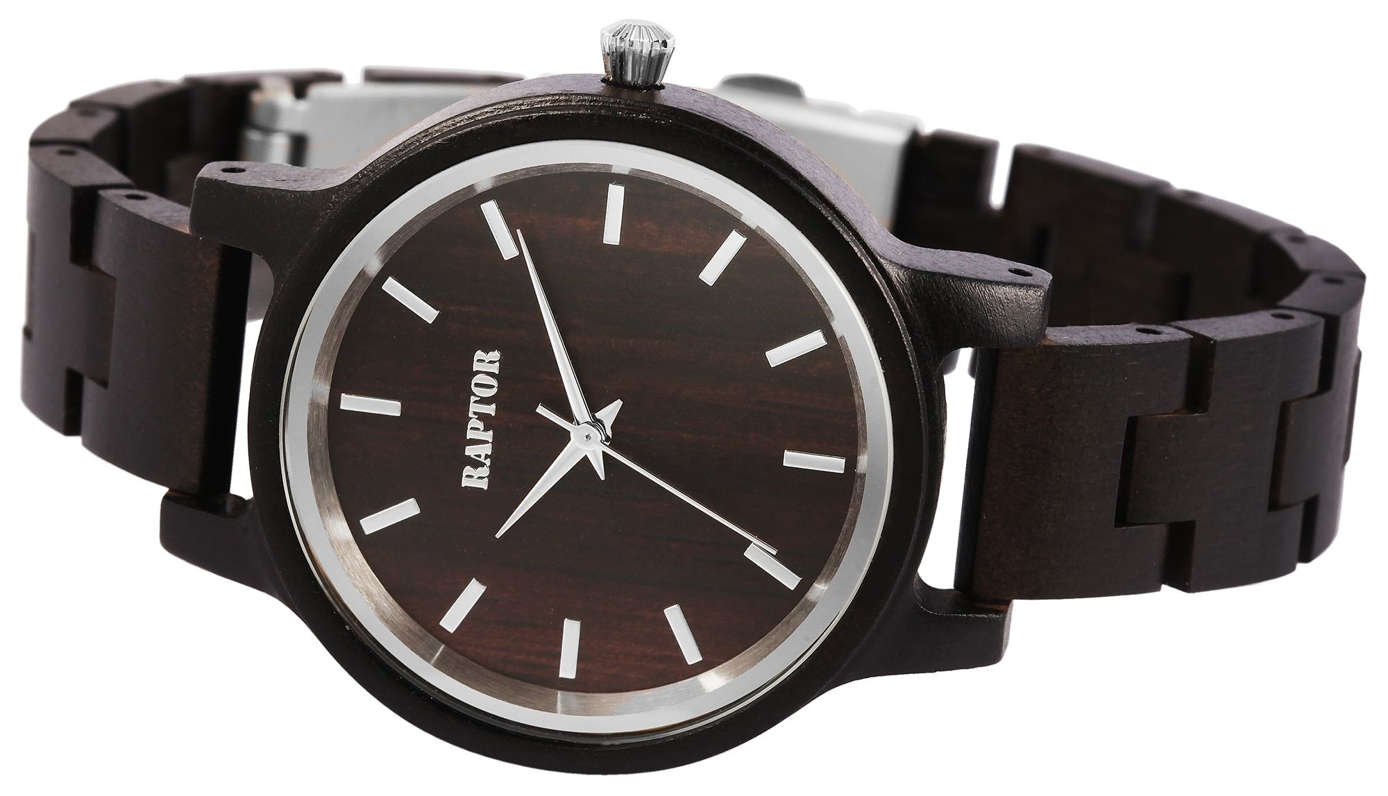 Het analoge 3-hands damespolshorloge van het merk Raptor heeft een hoogwaardig Miyota 2035 quartz uurwerk. De houten band is 14 mm breed bij de lug en kan worden geopend en gesloten met een zilverkleurige roestvrijstalen vouwsluiting. De totale lengte van het horloge is 19 cm. De houten kast met mineraalglas heeft een diameter van 36 mm en een kasthoogte van 10 mm. De achterkant van de kast is ook van hout. De 1 mm brede spiegelrand op het mineraalglas is een visueel hoogtepunt. De wijzers zijn uitgevoerd in dezelfde kleur als de spiegelrand en geven het horloge samen met de wijzerplaat een bijzondere, elegante uitstraling. Met het houten Raptor horloge draag je een absolute blikvanger om je pols die bij elke gelegenheid gecombineerd kan worden. Dankzij het lichtgewicht materiaal past het perfect om de pols en is het comfortabel om te dragen. Je ontvangt een garantiekaart en een originele Raptor doos als accessoires voor je product. Het horloge is een perfect cadeau. Bijvoorbeeld voor een verjaardag, Moederdag, Kerstmis of Valentijnsdag.