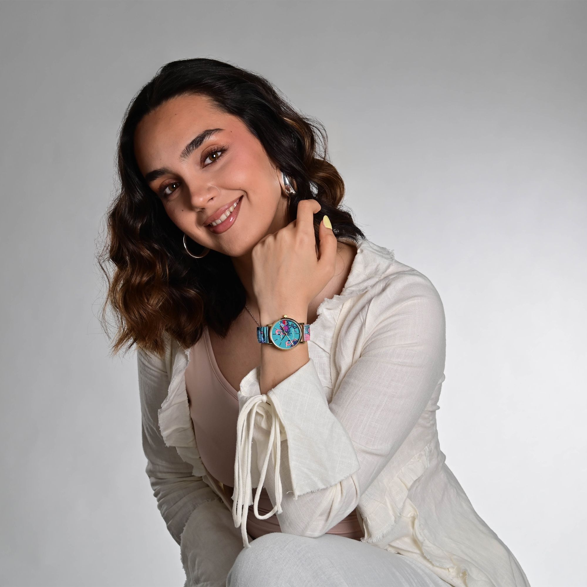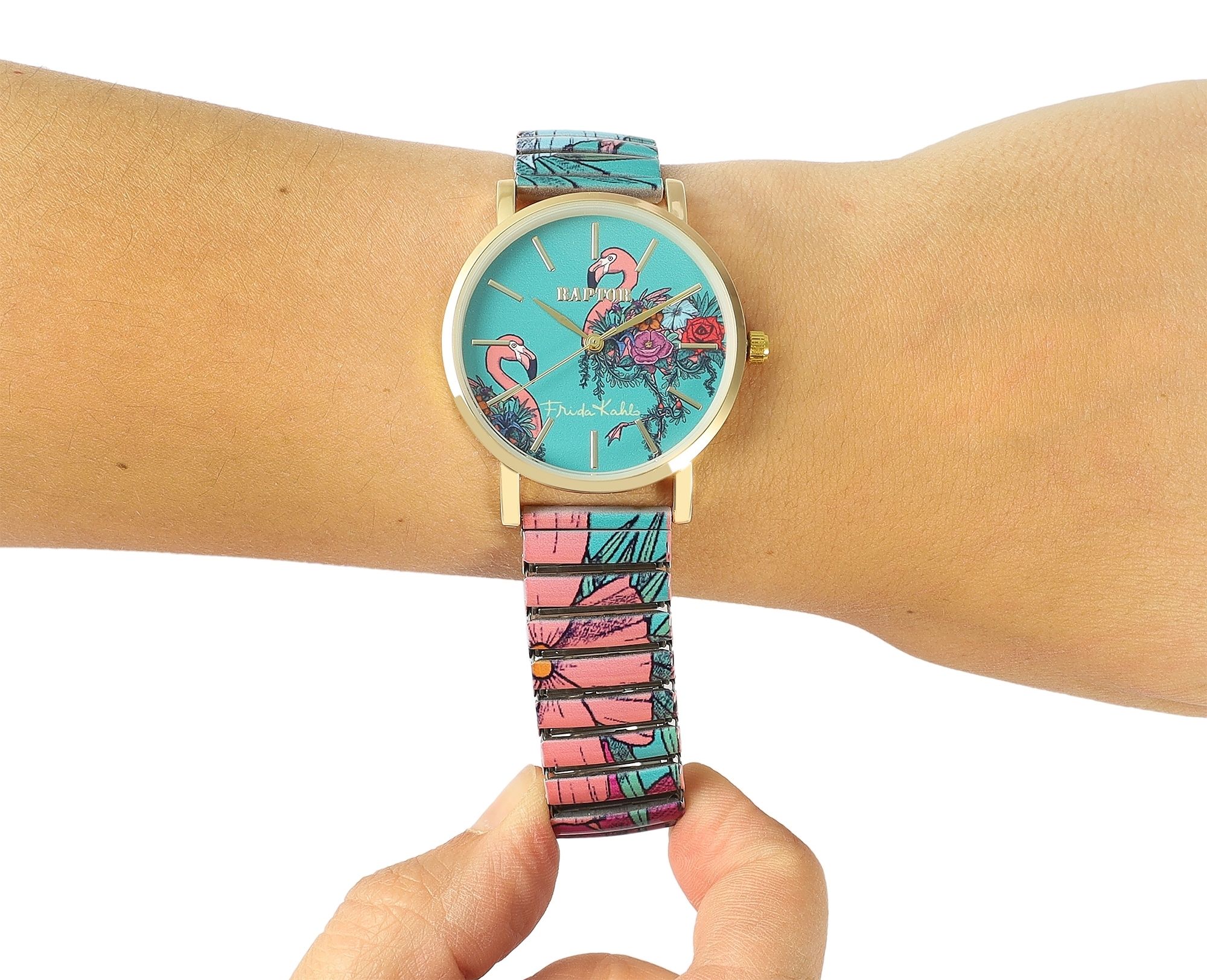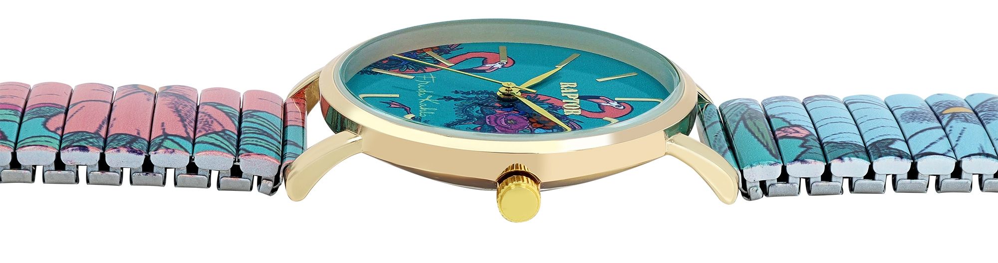 Het "Raptor X Frida Kahlo" horloge met trekband toont de iconische kunst en persoonlijkheid van de Mexicaanse schilderes op een unieke manier. Dit horloge is een eerbetoon aan Frida Kahlo's levendige kleuren, haar expressieve zelfportretten en de karakteristieke aard van haar werken.