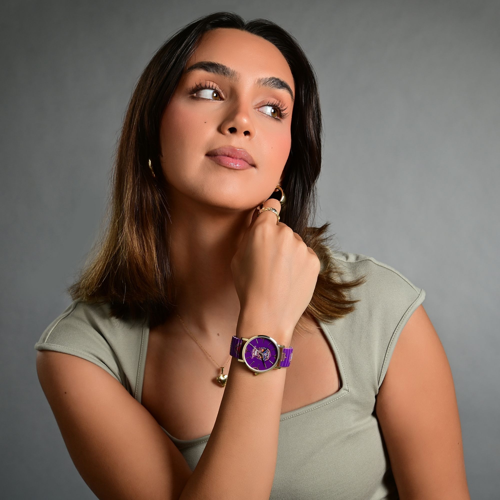 Het "Raptor X Frida Kahlo" horloge met trekband toont de iconische kunst en persoonlijkheid van de Mexicaanse schilderes op een unieke manier. Dit horloge is een eerbetoon aan Frida Kahlo's levendige kleuren, haar expressieve zelfportretten en de karakteristieke aard van haar werken.