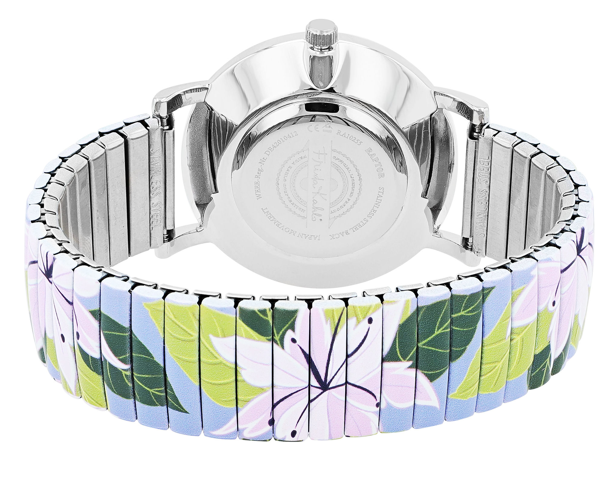 Het "Raptor X Frida Kahlo" horloge met trekband toont de iconische kunst en persoonlijkheid van de Mexicaanse schilderes op een unieke manier. Dit horloge is een eerbetoon aan Frida Kahlo's levendige kleuren, haar expressieve zelfportretten en de karakteristieke aard van haar werken.