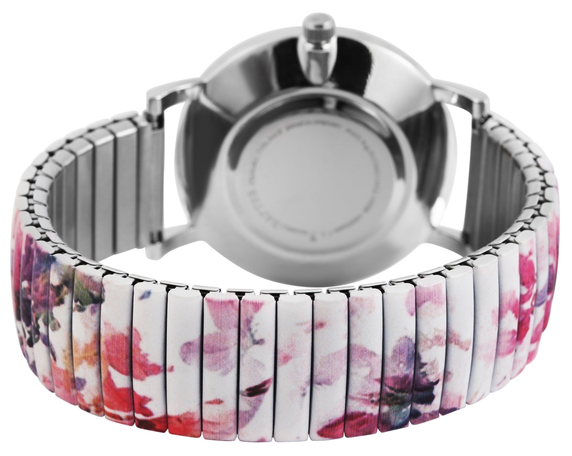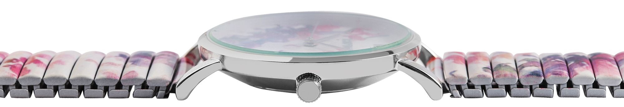 Het analoge dameshorloge met 3 wijzers en trekband heeft een hoogwaardig kwartsuurwerk. De witte roestvrijstalen trekband met bloemmotieven in verschillende roze en paarse tinten is 18 mm breed bij de lug en is bijzonder gemakkelijk over de pols te trekken dankzij de flexibele band. Het horloge is ook zeer comfortabel om te dragen dankzij de lichtheid en flexibiliteit. De totale lengte van het horloge is 18,5 cm. De lengte van de armband kan worden aangepast aan elke pols. De zilverkleurige metalen kast met mineraalglas heeft een diameter van 36 mm en een kasthoogte van 8 mm. De achterkant van de kast is gemaakt van roestvrij staal. Elk treinhorloge is een visueel hoogtepunt. Het kleurrijke bloemenpatroon van de band wordt weerspiegeld in de wijzerplaat en maakt het horloge tot een allround blikvanger. De wijzers en indexen zijn monochroom en passen goed bij de algehele look van het horloge. Met een keuze uit 17 verschillende patronen en drie verschillende kastkleuren is er zeker iets voor elke smaak. Al met al is het een onmisbaar sieraad dat om geen enkele pols mag ontbreken.