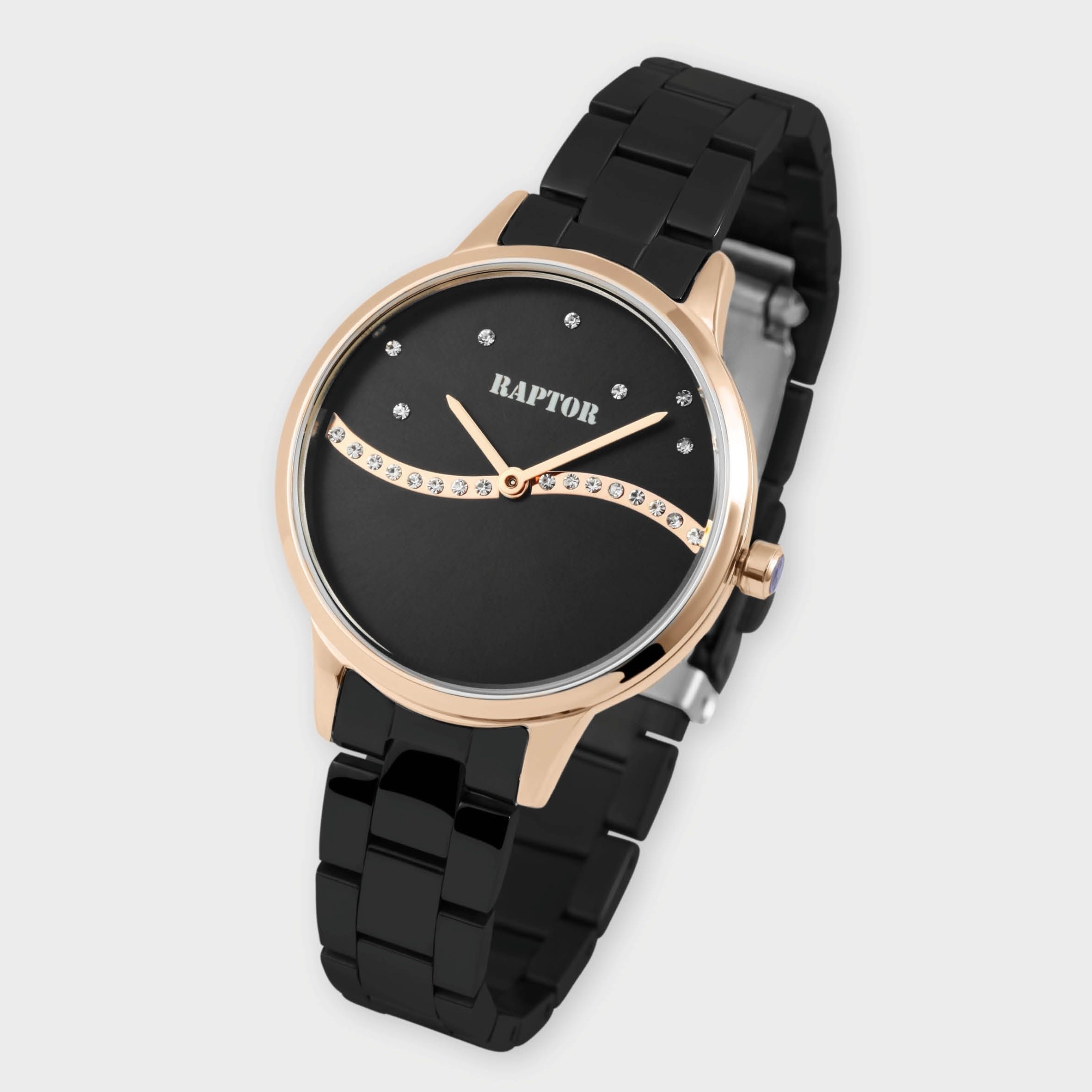 Het analoge 3-hands damespolshorloge van het merk Raptor heeft een hoogwaardig Miyota Y120 quartz uurwerk. De zwarte roestvrijstalen armband is 14 mm breed bij de lug en kan worden geopend en gesloten met een roestvrijstalen vouwsluiting. De totale lengte van het horloge is 21 cm. De zwarte metalen kast met mineraalglas heeft een diameter van 34 mm en een kasthoogte van 9 mm. Een bijzonder hoogtepunt is de zwarte wijzerplaat, waar een dunne golf van glittersteentjes doorheen is getekend. Boven de glinsterende golf bevinden zich individueel geplaatste strass-steentjes. De achterkant van de kast is gemaakt van roestvrij staal. De wijzers zijn ook roségoudkleurig en passen goed bij de algehele look van het horloge. Je ontvangt een garantiekaart en originele Raptor doos als accessoires voor je product.