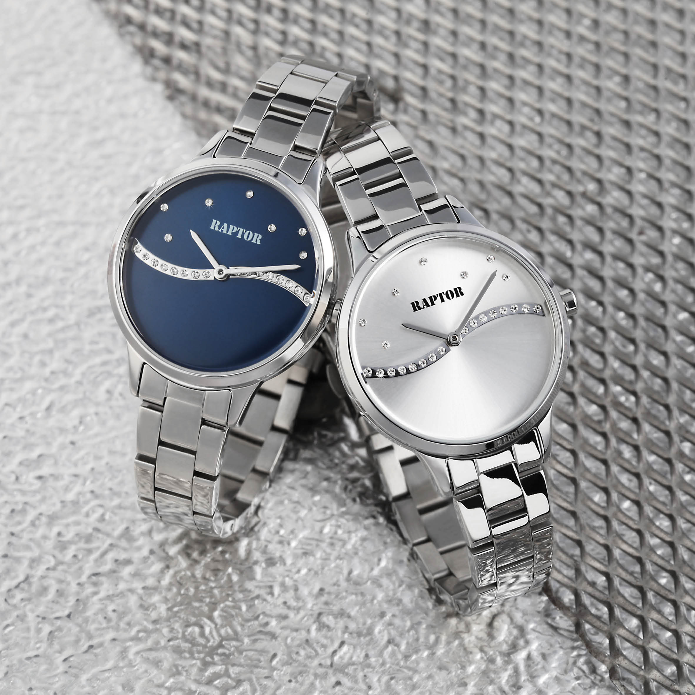 Het analoge 3-hands damespolshorloge van het merk Raptor heeft een hoogwaardig Miyota Y120 quartz uurwerk. De zilverkleurige roestvrijstalen armband is 14 mm breed bij de lug en kan worden geopend en gesloten met een roestvrijstalen vouwsluiting. De totale lengte van het horloge is 21 cm. De zilverkleurige metalen kast met mineraalglas heeft een diameter van 34 mm en een kasthoogte van 9 mm. Een bijzonder hoogtepunt is de donkerblauwe wijzerplaat waar een dunne golf van glittersteentjes doorheen loopt. Boven de glinsterende golf bevinden zich individueel geplaatste strass-steentjes. De achterkant van de kast is gemaakt van roestvrij staal. De wijzers zijn ook zilverkleurig en passen goed bij de algehele look van het horloge. Je ontvangt een garantiekaart en originele Raptor doos als accessoires voor je product.