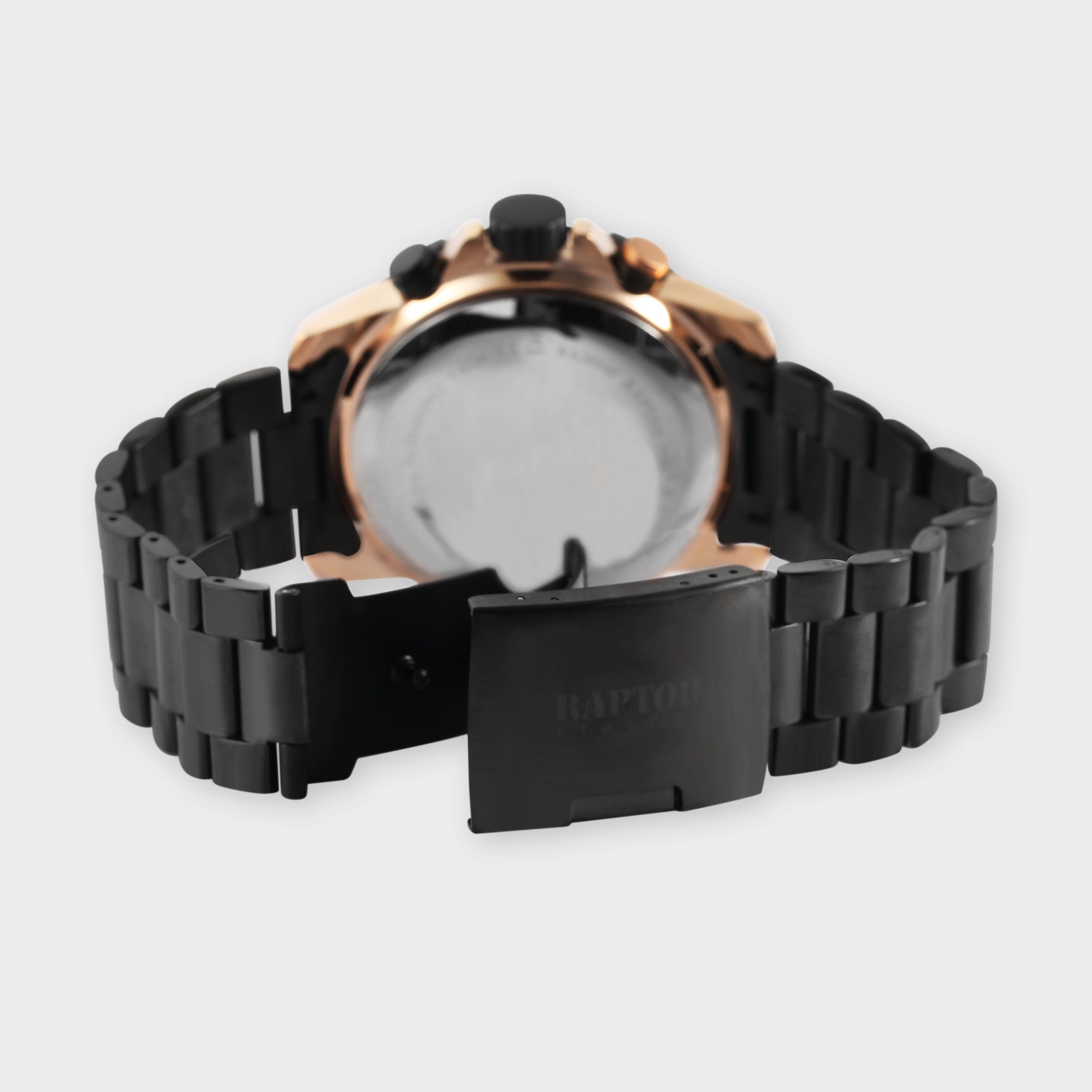 De Raptor Limited Chronograph "Kifah" maakt niet alleen indruk met zijn opvallende ontwerp, maar ook met zijn functionaliteit. Het middelpunt van dit herenhorloge is het hoogwaardige kwartsuurwerk, dat niet alleen staat voor ongeëvenaarde nauwkeurigheid, maar ook betrouwbaarheid en een lange levensduur garandeert. Het analoge display met drie wijzers en indexen met schaalverdeling en drie tellers op zes, negen en twaalf uur geven de chronograaf een duidelijke en gemakkelijk af te lezen esthetiek.