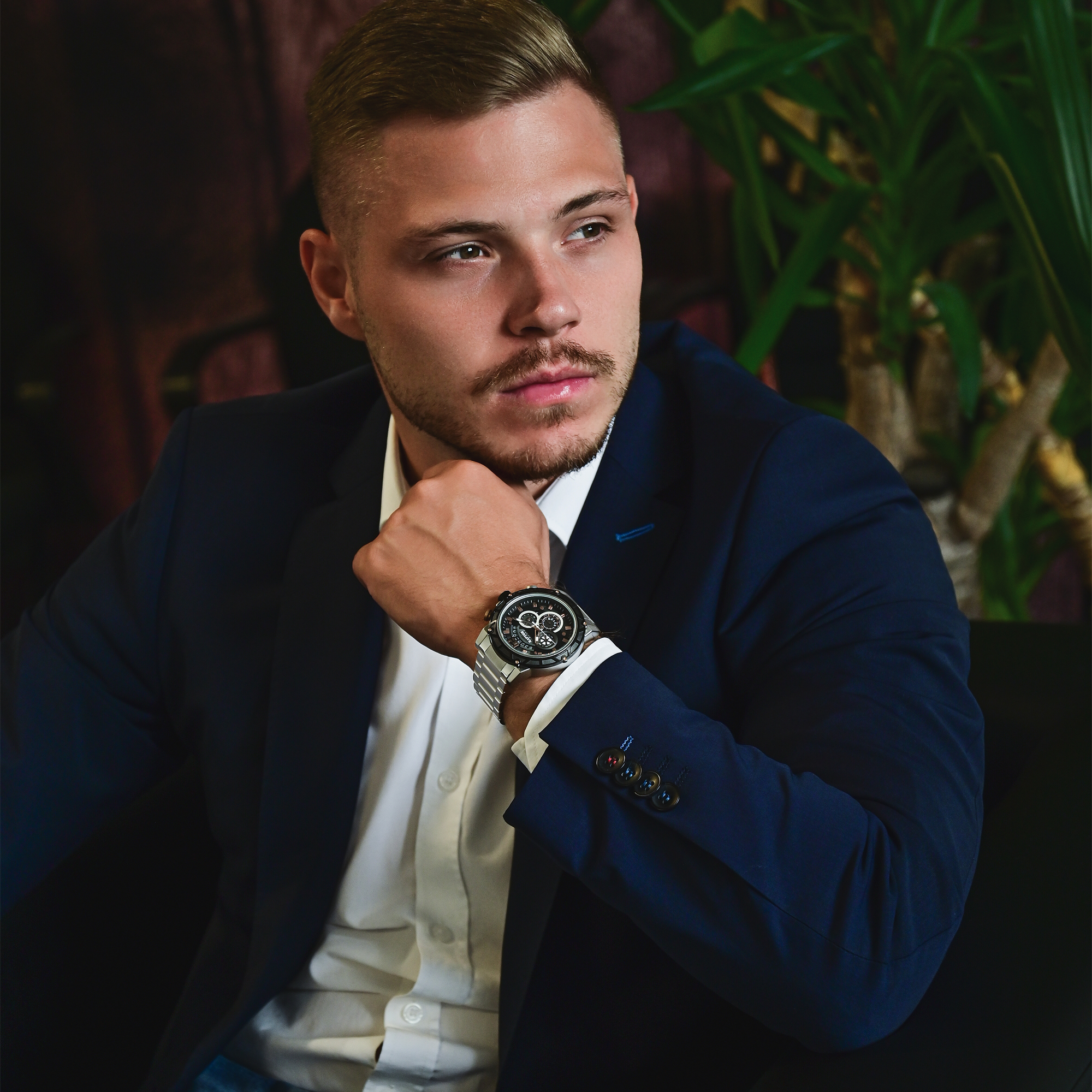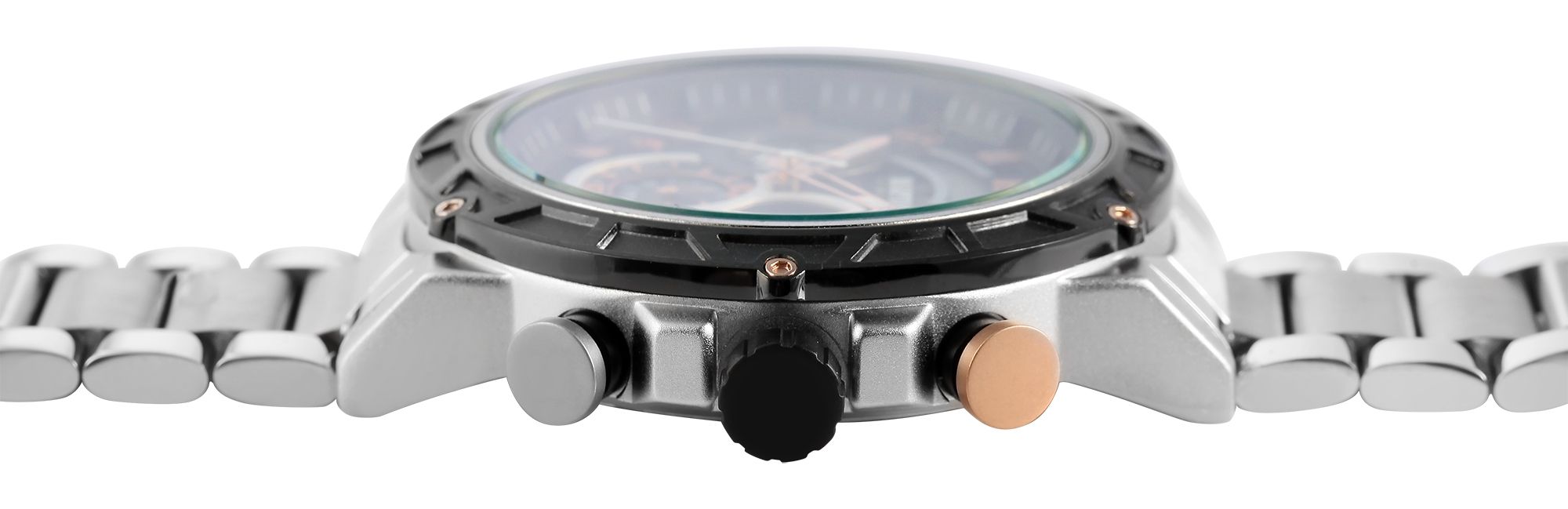 De roestvrijstalen schakelarmband is niet alleen een uitdrukking van robuustheid, maar ook van een verfijnde look. De totale lengte van 24 cm garandeert een comfortabele pasvorm en dankzij de inkortbare elementen kan de band op maat worden gemaakt. De metalen kast heeft een opvallende uitstraling met een diameter van 48 mm en een kasthoogte van 13 mm. Het mineraalglas beschermt de wijzerplaat, terwijl de roestvrijstalen achterkant van de kast de hoogwaardige afwerking benadrukt. Met een waterbestendigheid van 3 bar is het klaar om indrukwekkende prestaties te leveren in alle situaties.