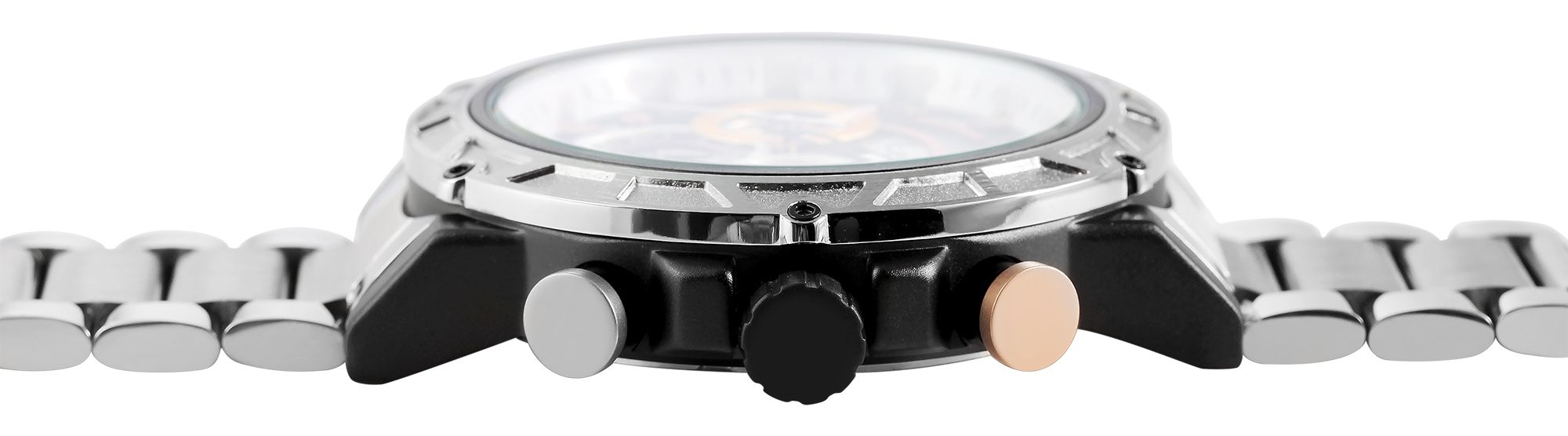 De roestvrijstalen schakelarmband is niet alleen een uitdrukking van robuustheid, maar ook van een verfijnde look. De totale lengte van 24 cm garandeert een comfortabele pasvorm en dankzij de inkortbare elementen kan de band op maat worden gemaakt. De metalen kast heeft een opvallende uitstraling met een diameter van 48 mm en een kasthoogte van 13 mm. Het mineraalglas beschermt de wijzerplaat, terwijl de roestvrijstalen achterkant van de kast de hoogwaardige afwerking benadrukt. Met een waterbestendigheid van 3 bar is het klaar om indrukwekkende prestaties te leveren in alle situaties.