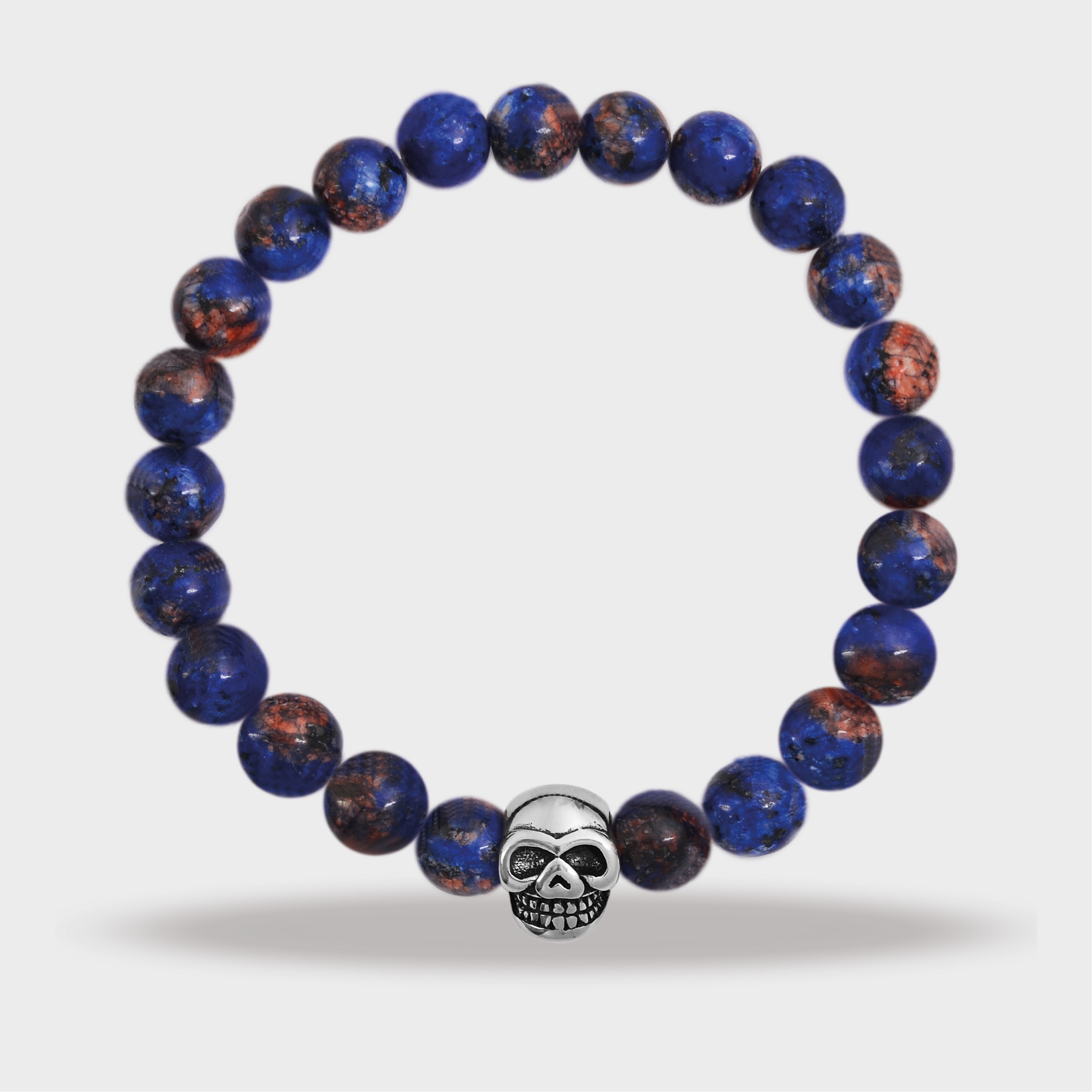 Productinformatie "Raptor Naturstein Kugelarmband (blauer Lazulith) mit Edelstahlelement Totenkopf"