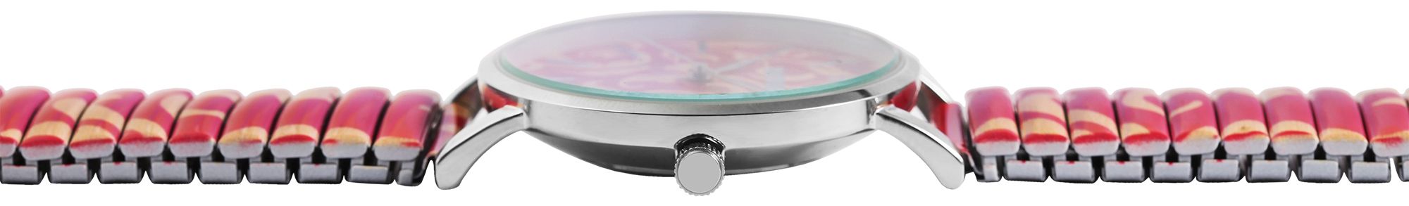 Het analoge dameshorloge met 3 wijzers en trekband heeft een hoogwaardig kwartsuurwerk. De roze en rosékleurige roestvrijstalen trekband is 18 mm breed bij de lug en is bijzonder gemakkelijk over de pols te trekken dankzij de flexibele band. Het horloge is ook zeer comfortabel om te dragen dankzij de lichtheid en flexibiliteit. De totale lengte van het horloge is 18,5 cm. De lengte van de armband kan worden aangepast aan elke pols. De zilverkleurige metalen kast met mineraalglas heeft een diameter van 36 mm en een kasthoogte van 8 mm. De achterkant van de kast is gemaakt van roestvrij staal. Elk treinhorloge is een visueel hoogtepunt. Het roze en rosékleurige patroon van de band komt terug in de wijzerplaat en maakt het horloge tot een allround blikvanger. De wijzers en indexen zijn monochroom en passen goed bij de algehele look van het horloge. Met een keuze uit 17 verschillende patronen en drie verschillende kastkleuren is er zeker iets voor elke smaak. Al met al is het een onmisbaar sieraad dat om geen enkele pols mag ontbreken.
