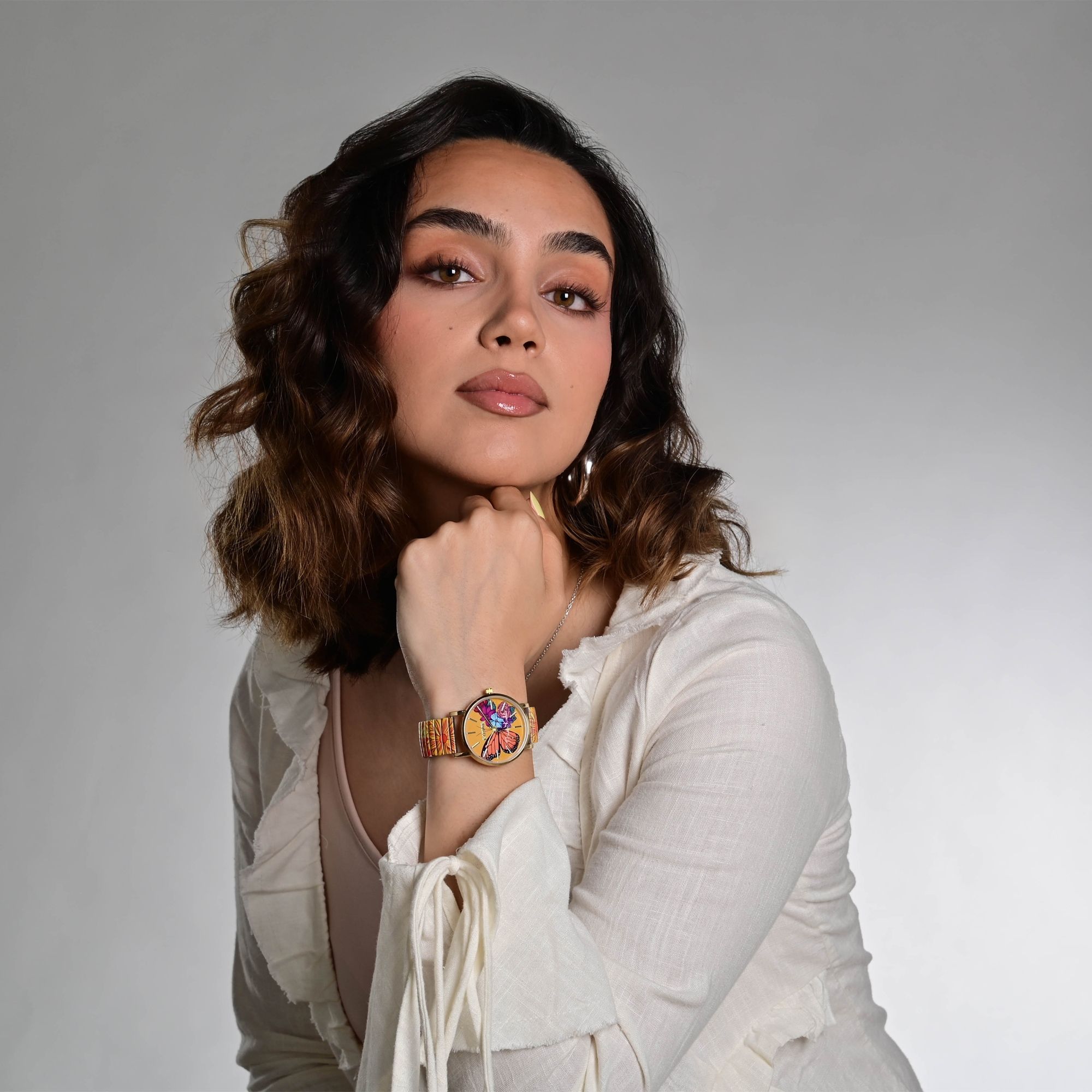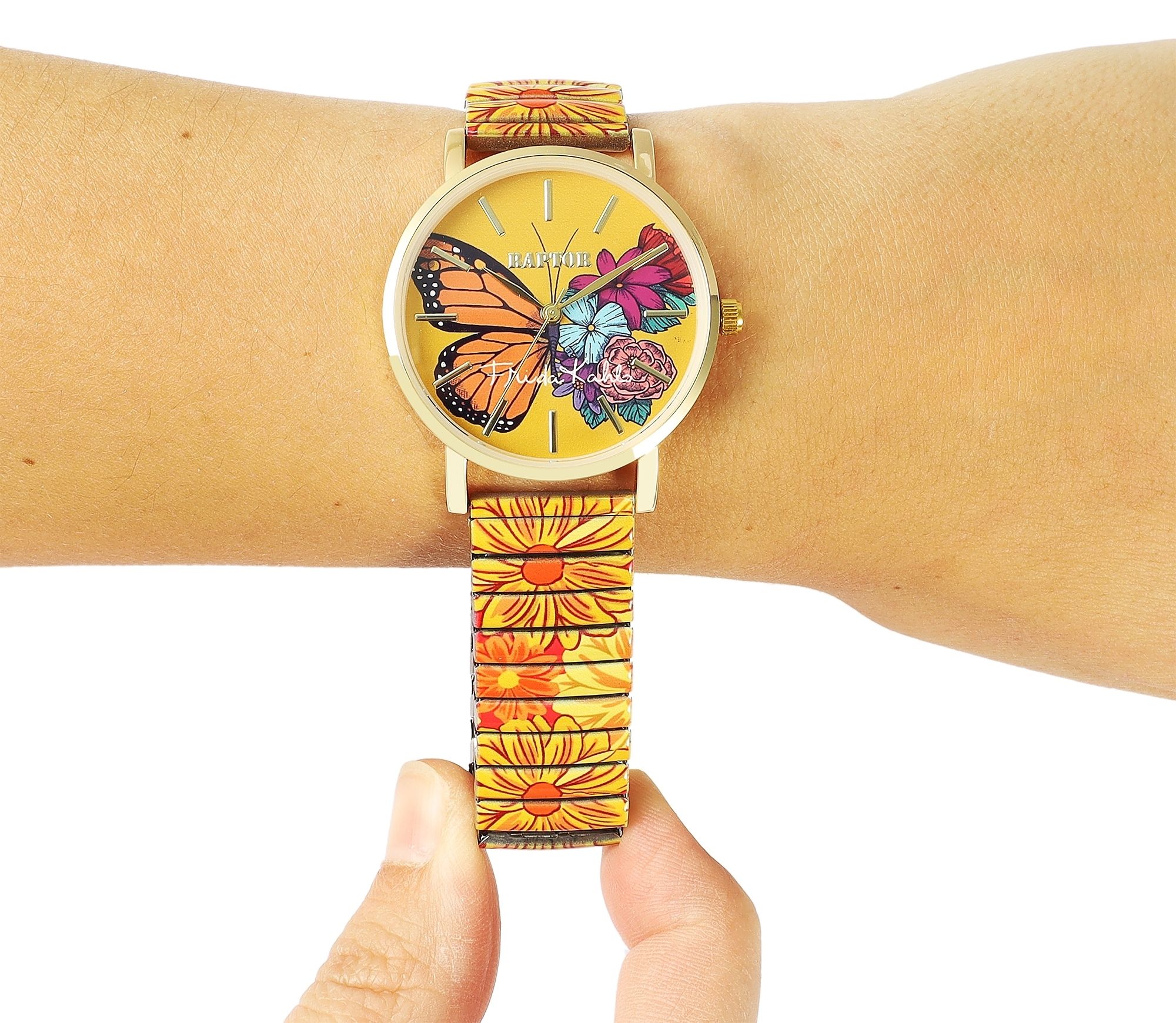 Het "Raptor X Frida Kahlo" horloge met trekband toont de iconische kunst en persoonlijkheid van de Mexicaanse schilderes op een unieke manier. Dit horloge is een eerbetoon aan Frida Kahlo's levendige kleuren, haar expressieve zelfportretten en de karakteristieke aard van haar werken.