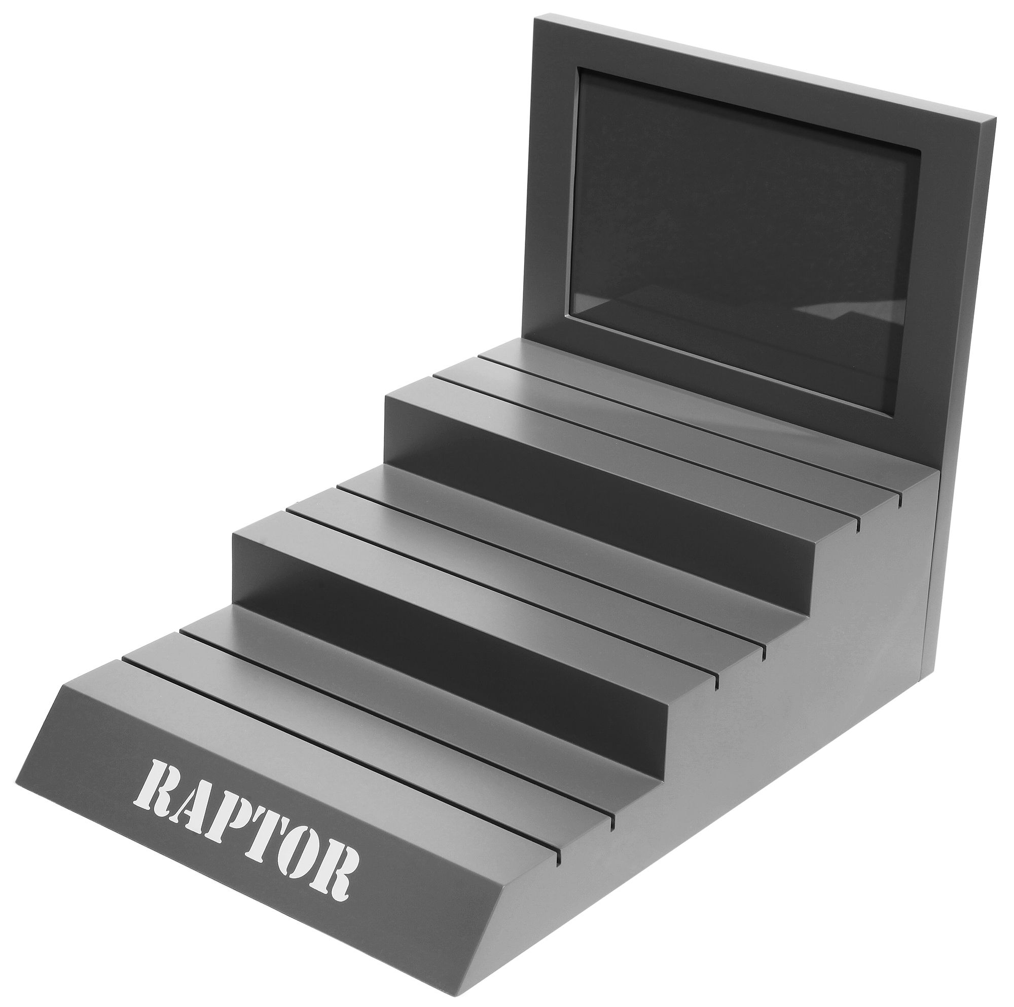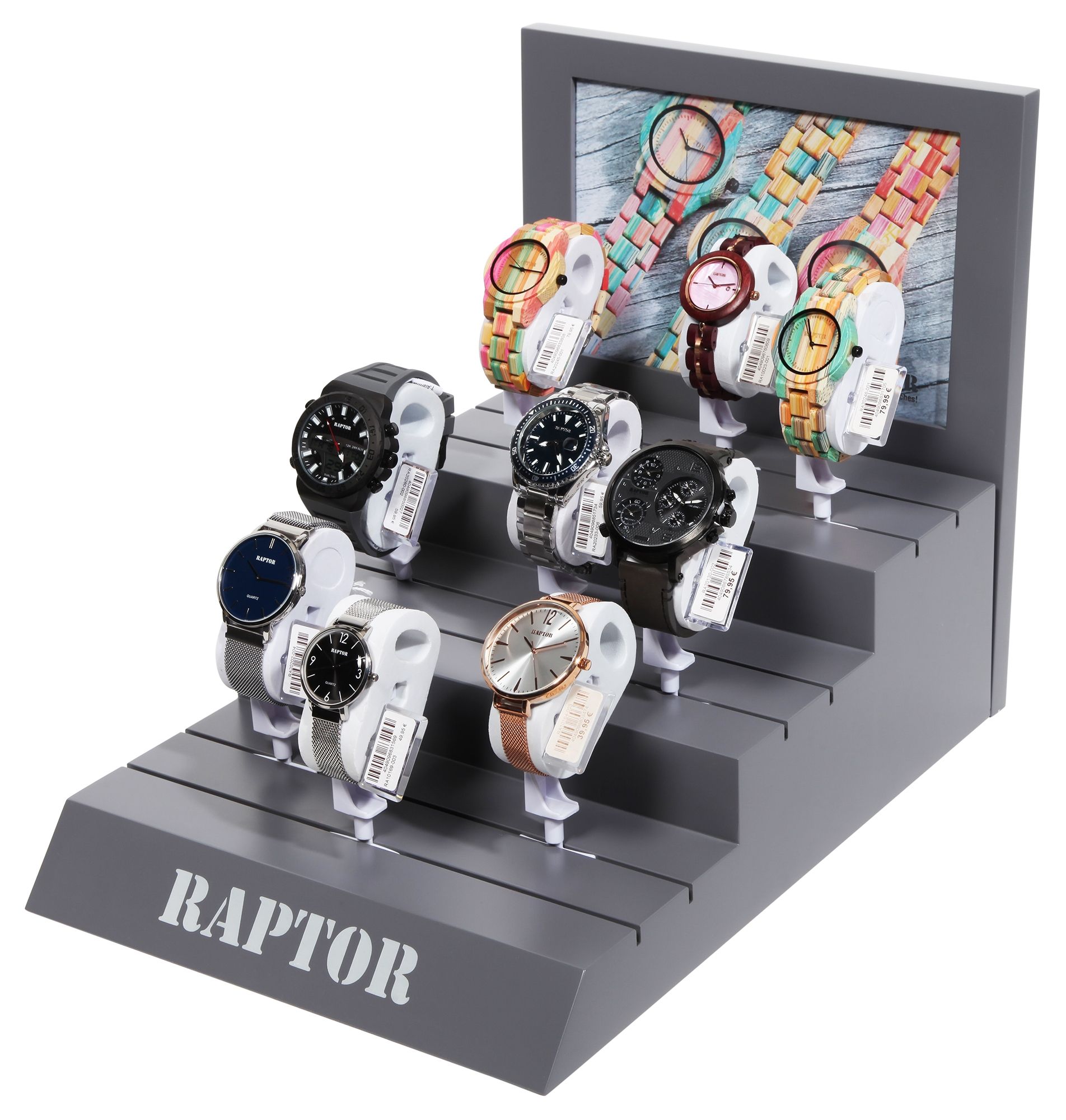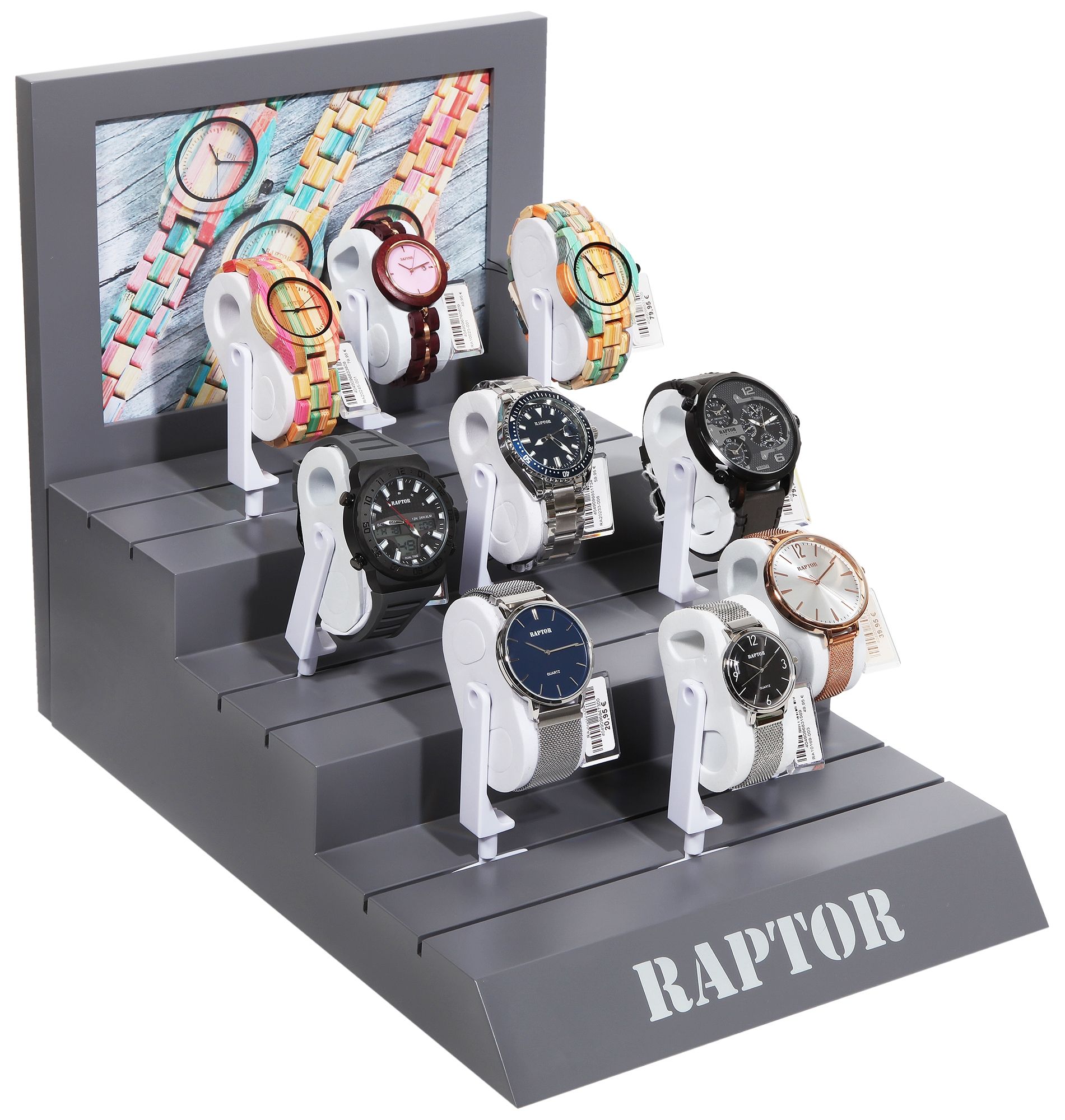De Raptor houten display is de ideale verkoopbevorderende oplossing om je exclusieve Raptor horlogecollectie stijlvol te presenteren.