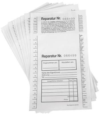 Bij dit product ontvang je 100 reparatiezakjes in een verpakkingseenheid, gemaakt van stevige papierkwaliteit en bedrukt met zwarte letters. De zakjes zijn doorlopend genummerd en worden geleverd met een afneembare slip voor de klant. Het formaat resulteert in een lengte van 20 cm en een breedte van 11,5 cm.