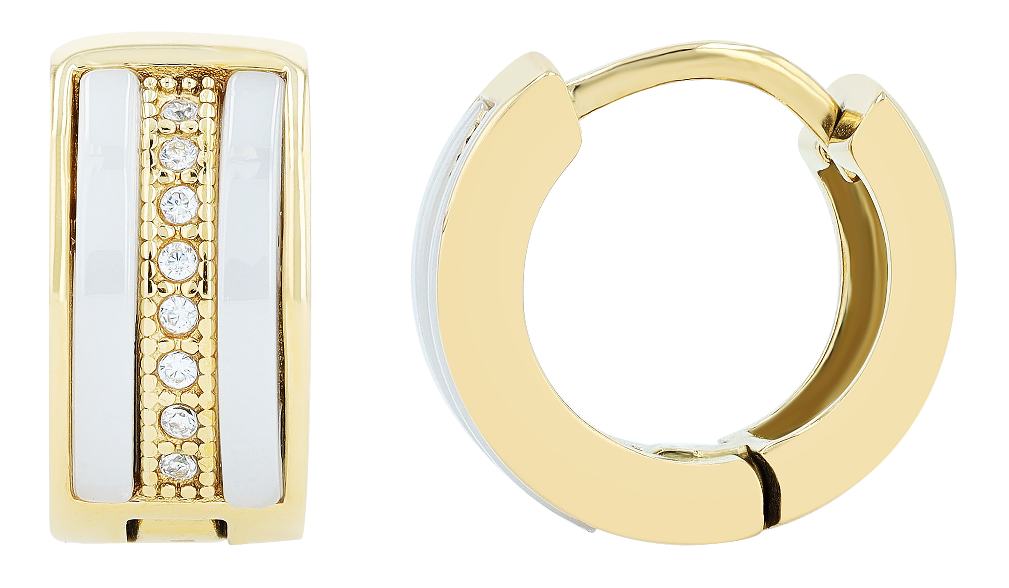 De vrouwelijke scharnierende hoepeloorbellen zijn gemaakt van roestvrij staal en gedeeltelijk afgewerkt met keramiek. Deze hoepeloorbellen zijn verkrijgbaar in twee geraffineerde kleurvariaties en bieden tijdloze elegantie en een verfijnde look. Rechts en links is een strook bedekt met wit keramiek, terwijl 9 zirkonia steentjes in het midden voor een fonkelende schittering zorgen. De sluiting is een praktische sluiting die moeiteloos aan- en uittrekken garandeert. Het formaat resulteert uit een lengte van 15 mm, een breedte van 9 mm en een dikte van 6 mm. Als alledaags accessoire of voor speciale gelegenheden, deze hoepeloorbellen zijn perfect voor iedereen die van stijlvolle elegantie houdt.