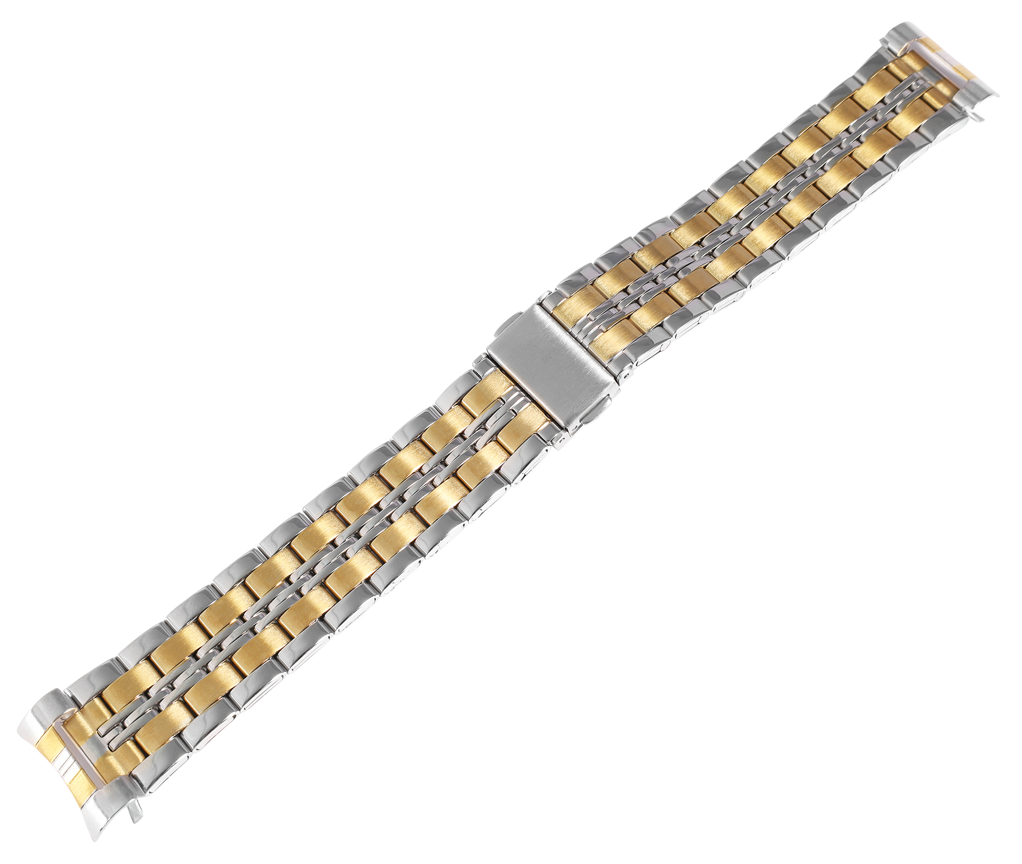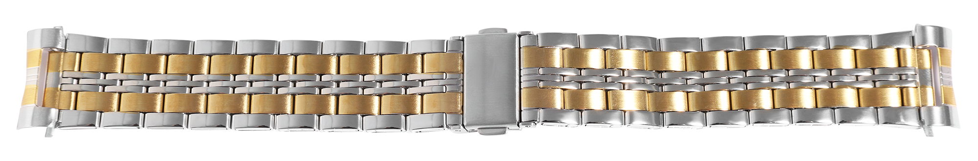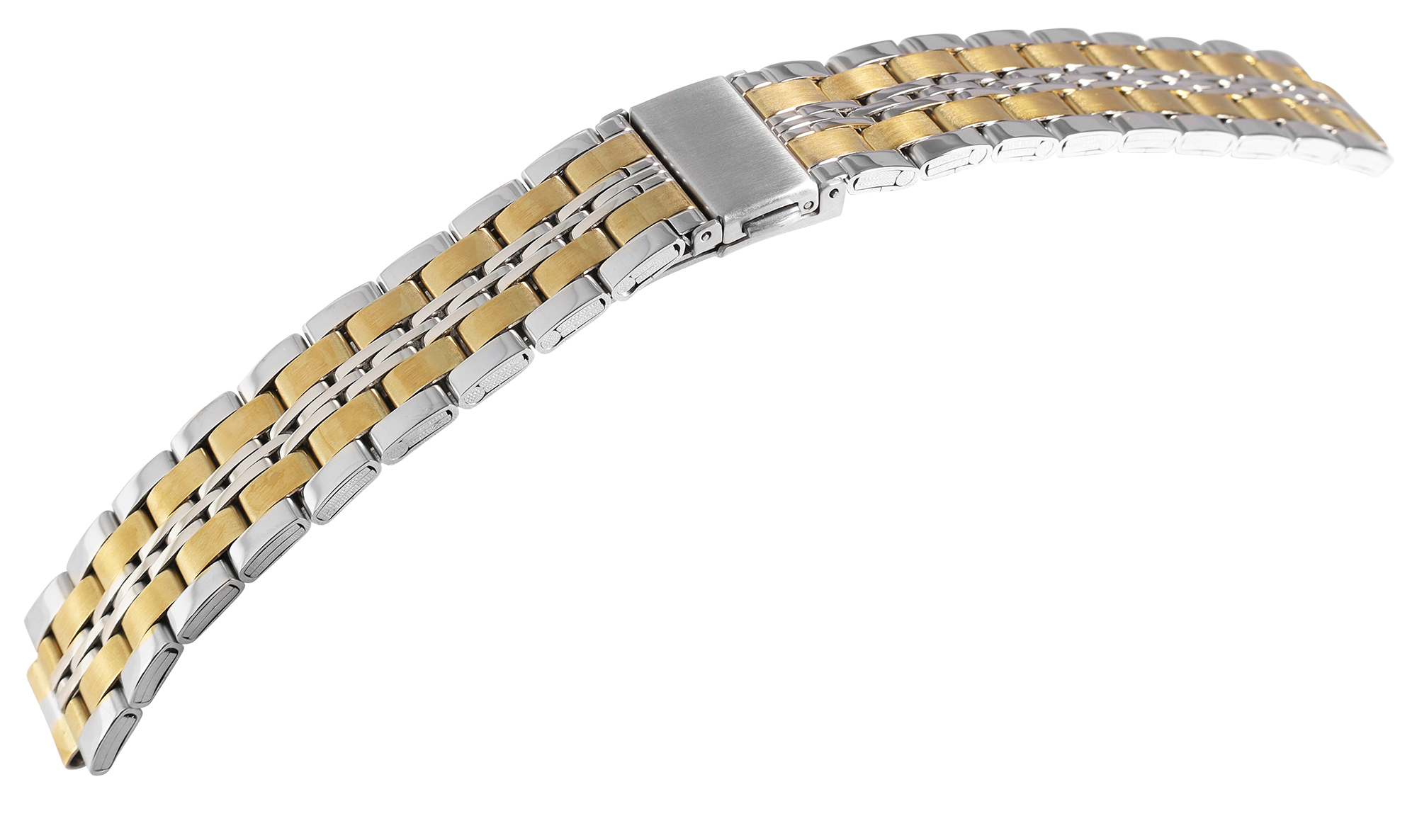 De tweekleurige horlogeband is gemaakt van roestvrij staal en kan worden geopend en gesloten met een zilverkleurige vouwsluiting van roestvrij staal. Het heeft een lugbreedte van 20 mm. Het vervangende horlogebandje bestaat uit veel elementen die met weinig moeite kunnen worden verwijderd. Dit betekent dat het bandje aan elke pols kan worden aangepast. De totale lengte van de schakelarmband is 17,5 cm. De lug is verwisselbaar. Het is mogelijk om een halfronde lug te gebruiken, die zich perfect aanpast aan de kast, of een rechte lug, die het horloge een speciale look geeft en compatibel is met elke kast. De afzonderlijke elementen bestaan elk uit meerdere afzonderlijke delen die de roestvrijstalen armband een meerrijig uiterlijk geven wanneer deze in elkaar wordt gezet. De buitenste zilverkleurige delen en de drie kleine zilverkleurige middelste delen zijn gepolijst en de goudkleurige rijen ertussen zijn mat afgewerkt. Door dit type afwerking van het oppervlak past deze armband perfect bij elk horloge.