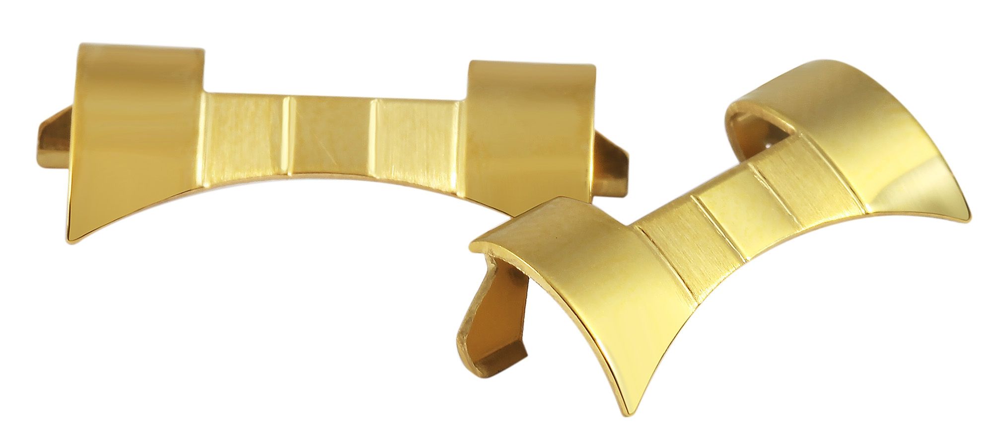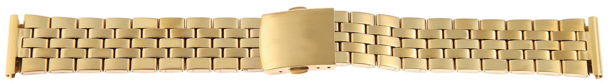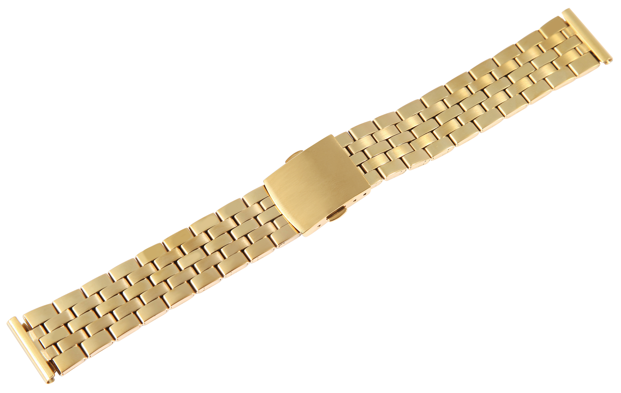 De goudkleurige horlogeband is gemaakt van roestvrij staal en kan worden geopend en gesloten met een goudkleurige vouwsluiting van roestvrij staal. Het is verkrijgbaar in de lugbreedtes 12 mm, 14 mm, 16 mm, 18 mm, 19 mm, 20 mm, 21 mm, 22 mm en 24 mm. Het vervangingsbandje bestaat uit veel elementen die met weinig moeite kunnen worden verwijderd. Dit betekent dat het bandje aan elke pols kan worden aangepast. De totale lengte van de schakelarmband is 17,5 cm. De lug is verwisselbaar. Je hebt de optie om een halfronde lug te gebruiken, die zich perfect aanpast aan de kast, of een rechte lug, die het horloge een speciale look geeft en compatibel is met elke kast. De afzonderlijke elementen bestaan elk uit vijf afzonderlijke delen, die de roestvrijstalen armband een vijfrijig uiterlijk geven als hij in elkaar zit. De buitenste delen en het middelste deel zijn gepolijst en de rijen ertussen zijn mat afgewerkt. Dit type afwerking betekent dat deze armband perfect past bij elk horloge.
