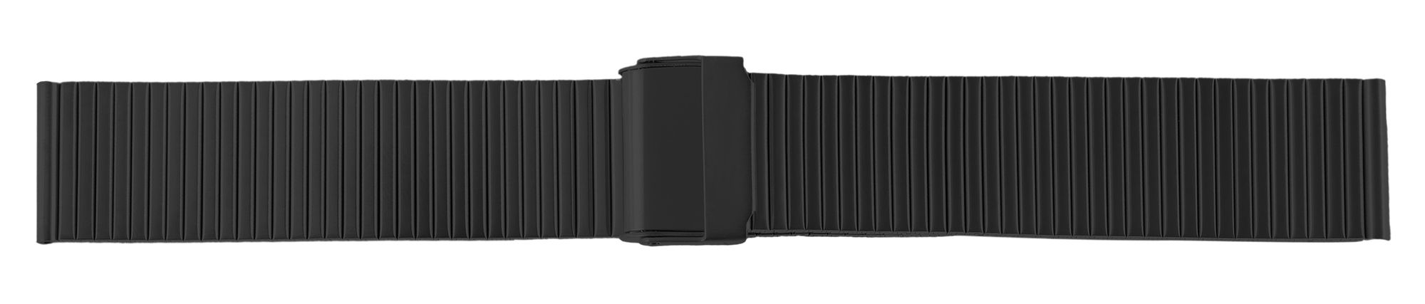 De zwarte horlogeband is gemaakt van roestvrij staal en kan worden geopend en gesloten met een zwarte roestvrijstalen haaksluiting. Het vervangende horlogebandje ziet eruit als een trekbandje en bestaat uit veel kleine elementen op een rij die niet kunnen worden verwijderd. De lengte van de armband kan echter worden aangepast met behulp van de sluiting, die trapsgewijs kan worden aangepast zoals een Milanese armband. Dankzij het ontwerp, dat erg lijkt op een Milanese armband, is het horlogebandje erg comfortabel om te dragen en kan het perfect worden aangepast aan elke pols dankzij de fijnafstelling in stappen. De totale lengte van het horlogebandje is 18,5 cm. Het horlogebandje heeft een lugbreedte van 18 mm. De lug is recht en daarom compatibel met elk horloge.