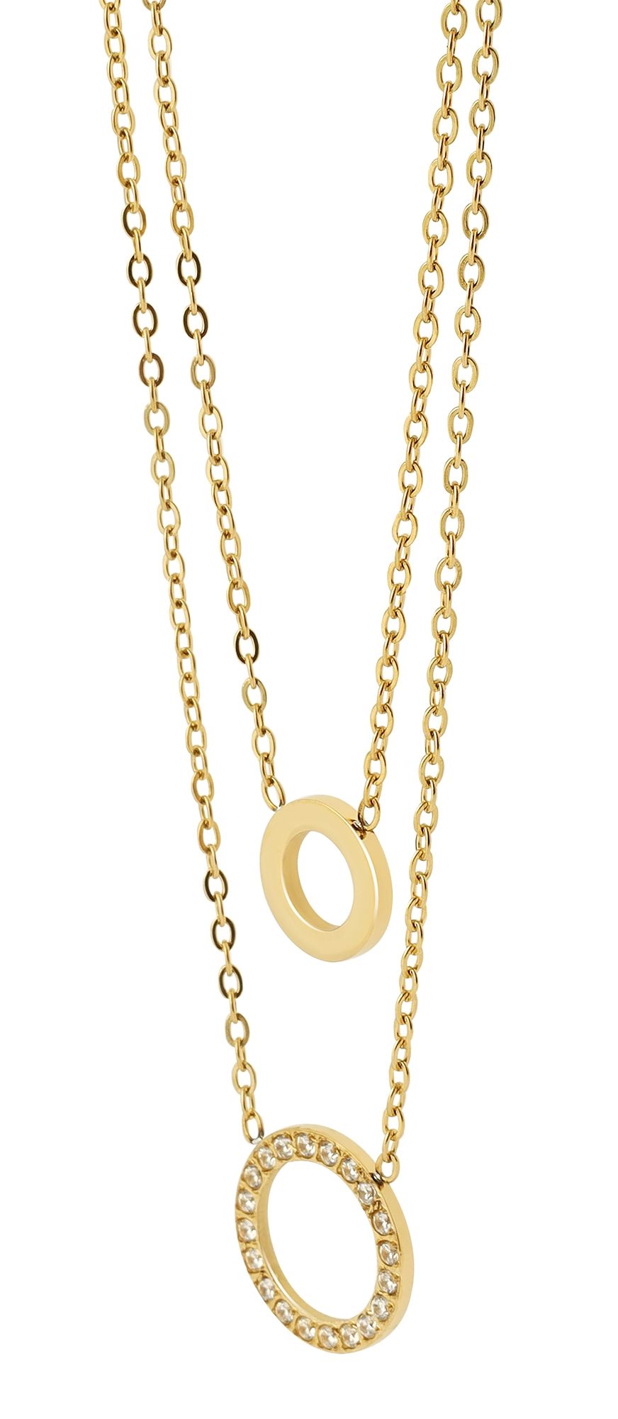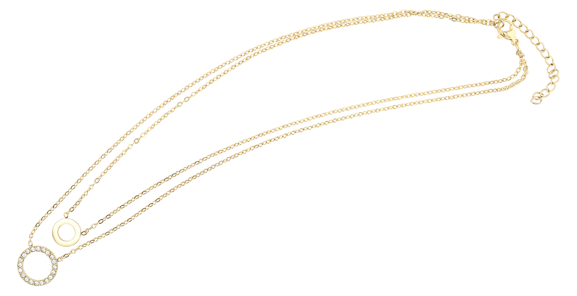 Ketting 2: Een lengte van 40 cm + 5 cm verlenging. De grotere, eveneens open cirkelvormige hanger met een diameter van 14 mm is bezet met fonkelende stenen die schitteren in het licht en een vleugje glamour toevoegen.
