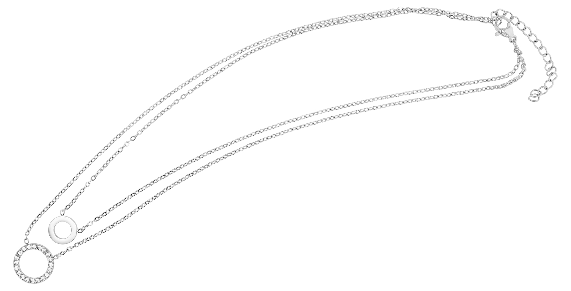 Ketting 2: Een lengte van 40 cm + 5 cm verlenging. De grotere, eveneens open cirkelvormige hanger met een diameter van 14 mm is bezet met fonkelende stenen die schitteren in het licht en een vleugje glamour toevoegen.
