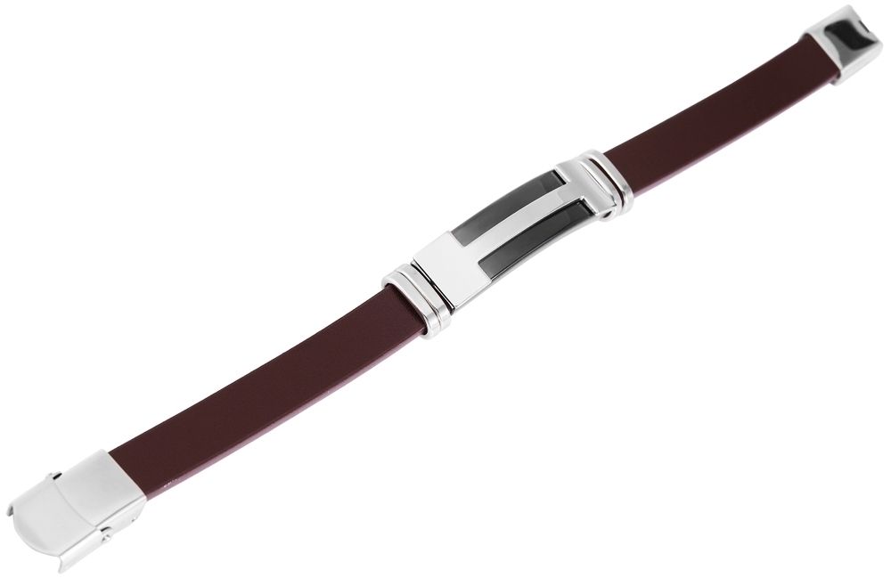 Das Echtlederarmband der Marke Akzent ist aus einem 12 mm breiten Echtlederriemen gefertigt und fasst mittig ein silberfarbenes Edelstahlelement, welches an den Seiten schwarz abgesetzt ist. Öffnen und schließen lässt sich das moderne Schmuckarmband mit einem silberfarbenen Hakenverschluss, der ebenfalls aus Edelstahl gefertigt ist.
