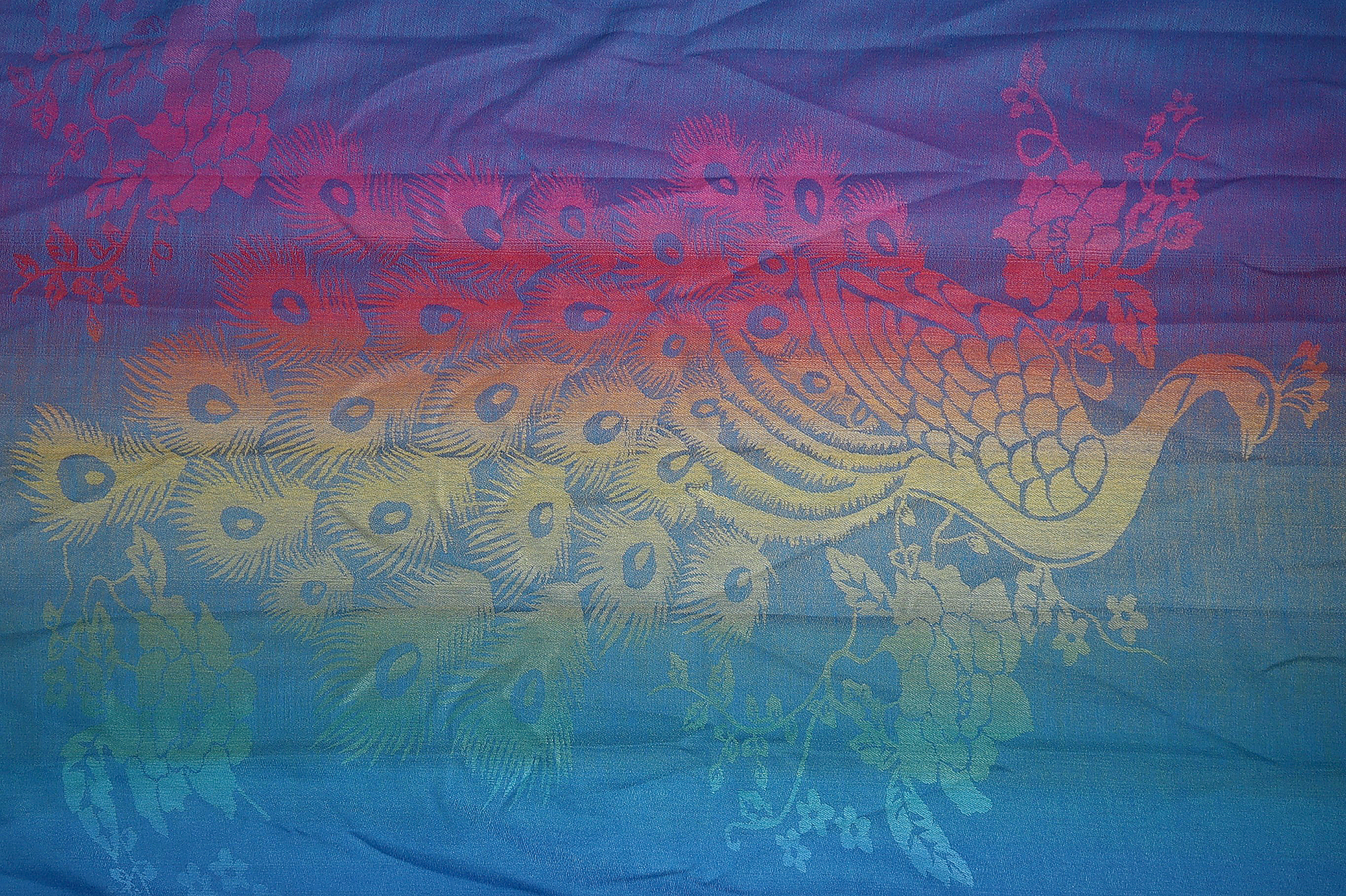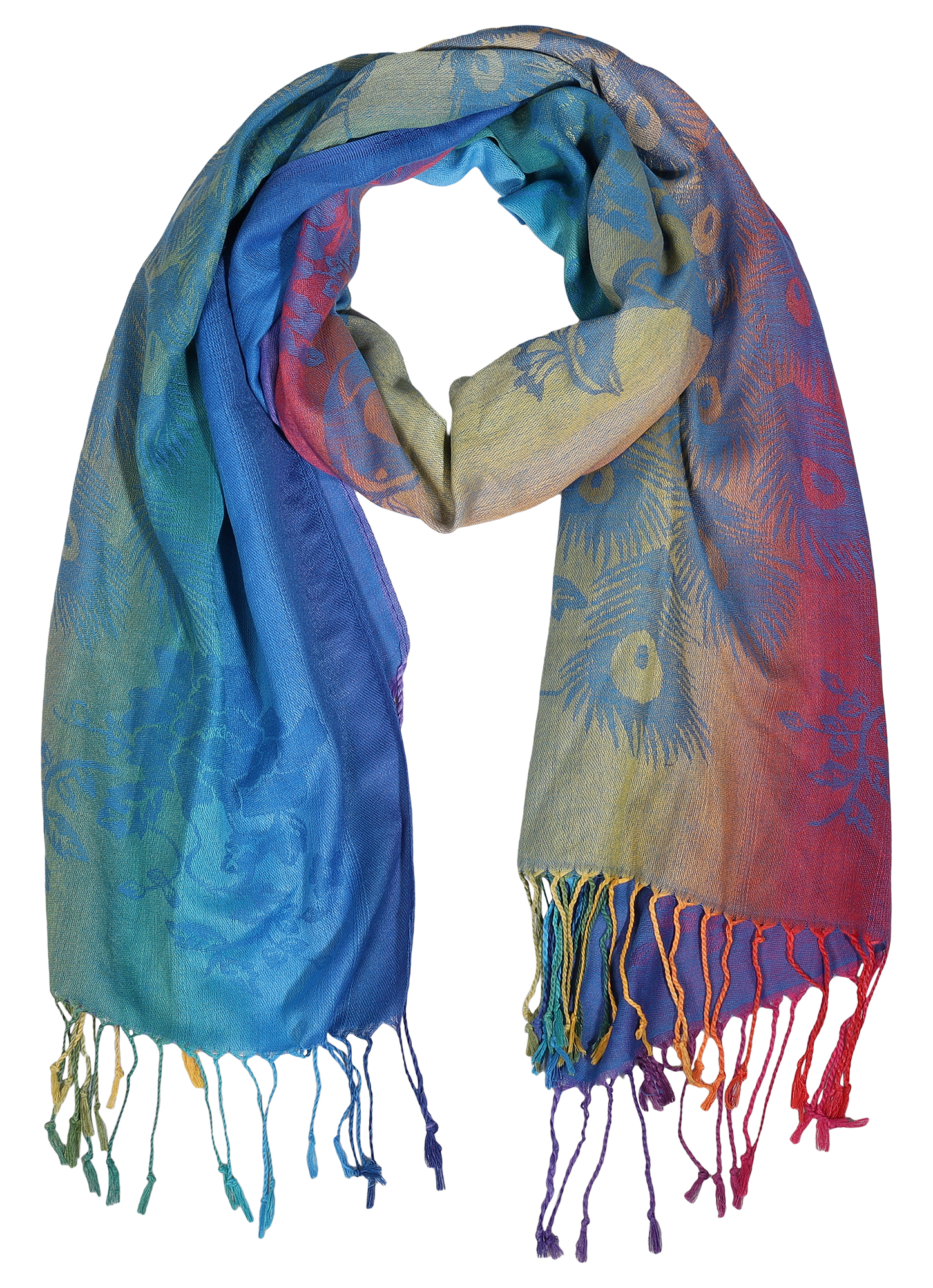 Deze sjaal in een vloeiend ombré-effect met kleurrijke en gedurfde tinten, presenteert een unieke pauw als motief. - Model 013 - 017(100% polyester):