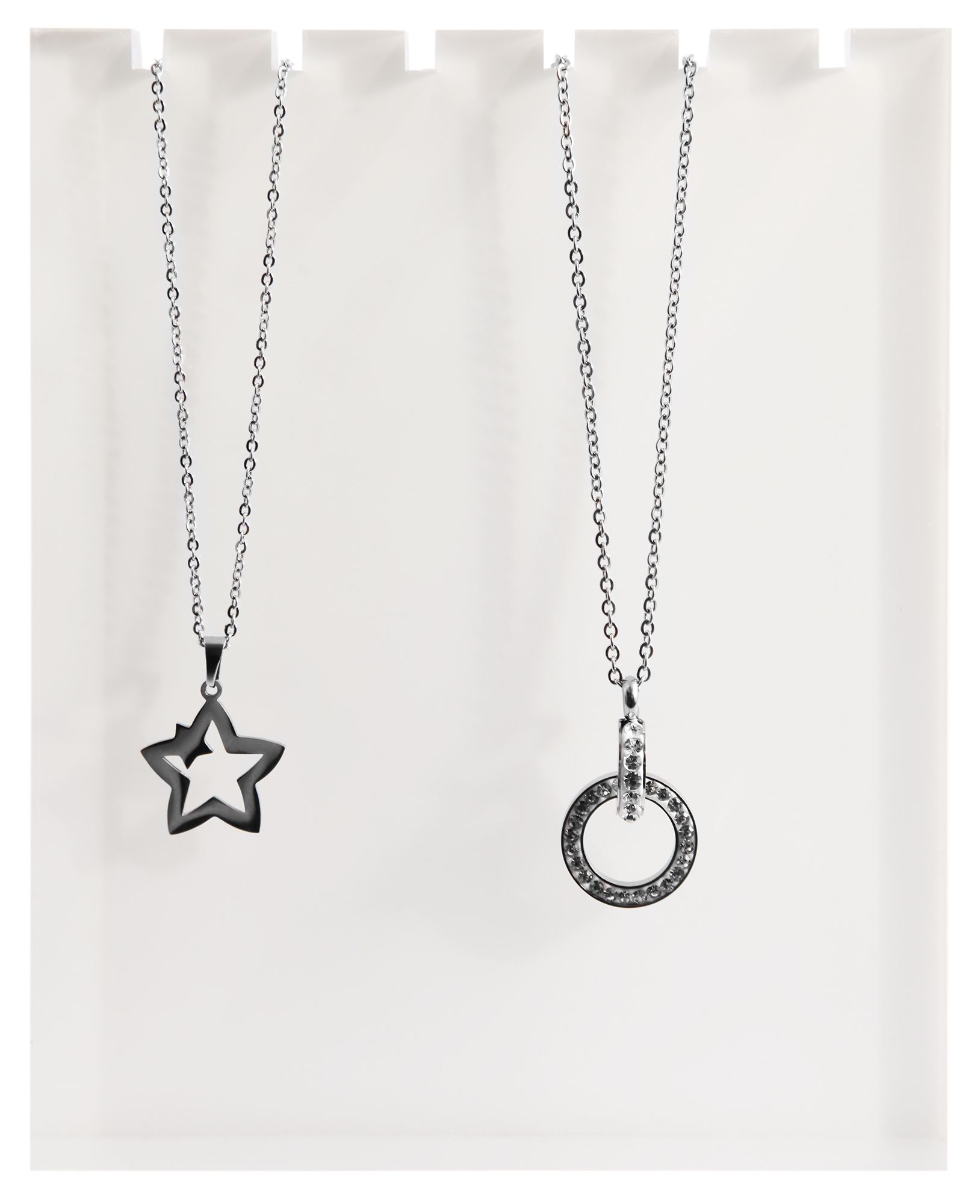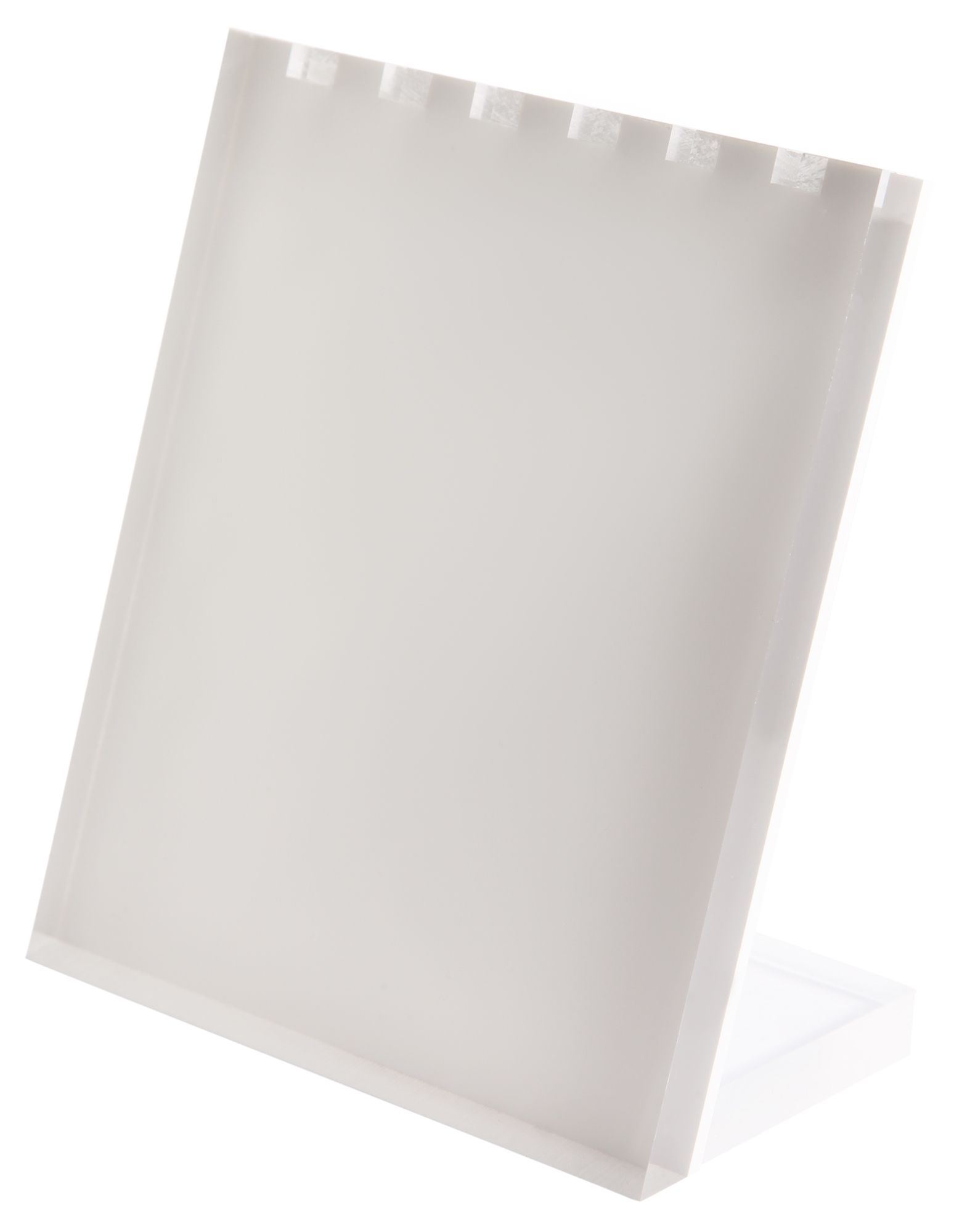 De sieradendisplay is gemaakt van kunststof en heeft een witte achterkant. Het is bedoeld voor het presenteren van kettingen en armbanden. De display heeft een dikte van 14 mm en staat op een 7 mm dikke voet. De bovenrand van het display heeft zes uitsparingen van 14 mm diep en 2 mm breed.