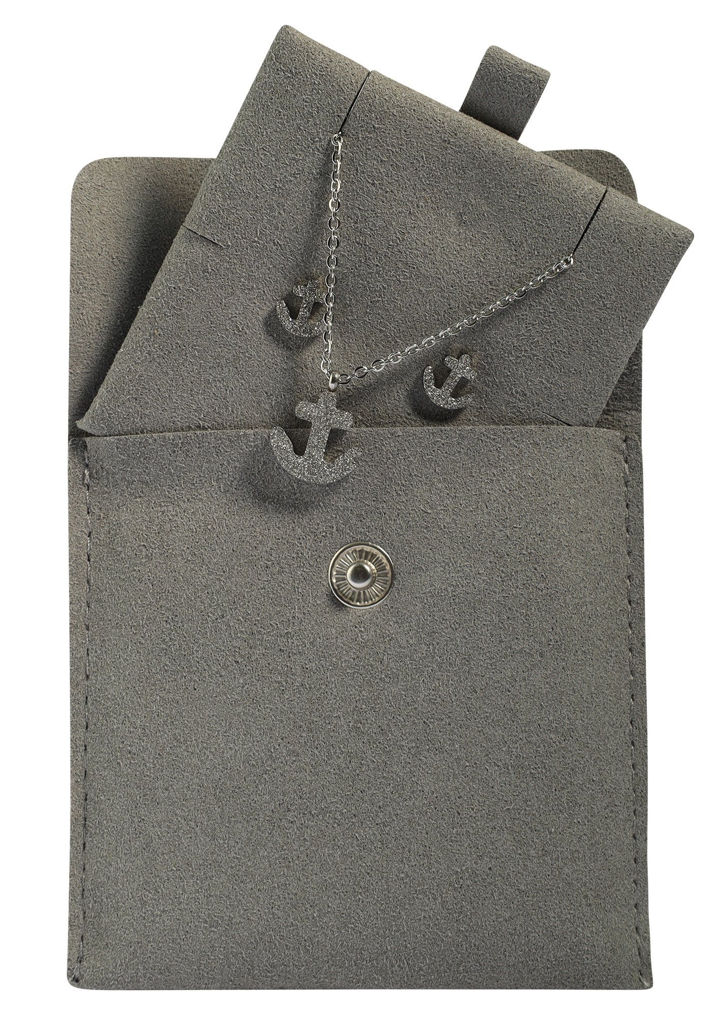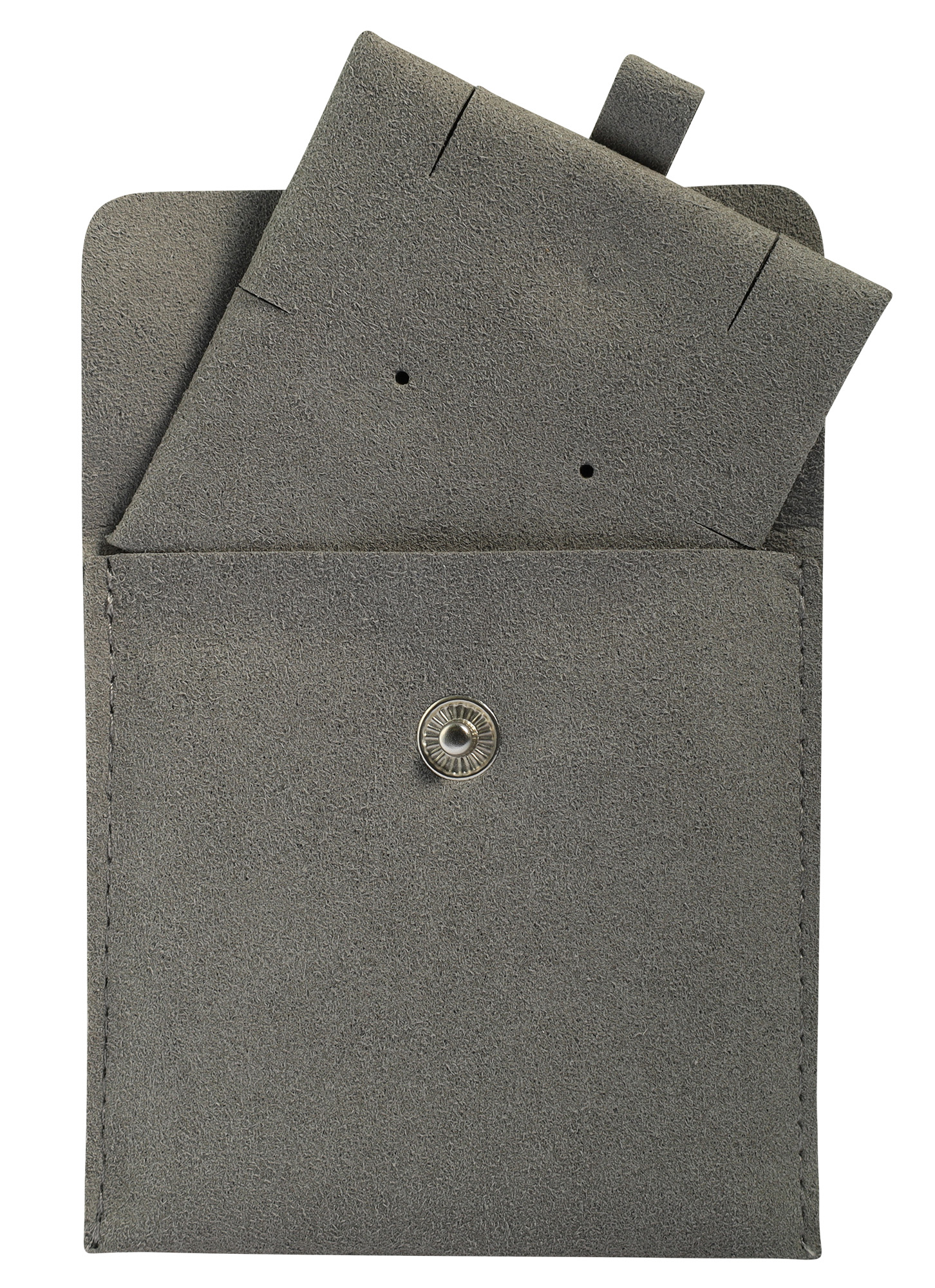 Deze sieradenetuis in grijs of kaki, met afmetingen van 7,7 x 7,7 x 1,5 cm, zijn gemaakt van bijzonder zacht imitatieleer en worden gesloten met een drukknoop. Binnenin zit een juwelenkaart, ook van imitatieleer en verstevigd met karton, die geschikt is voor het bevestigen en opbergen van kettingen, oorstekers of hangers en armbanden.