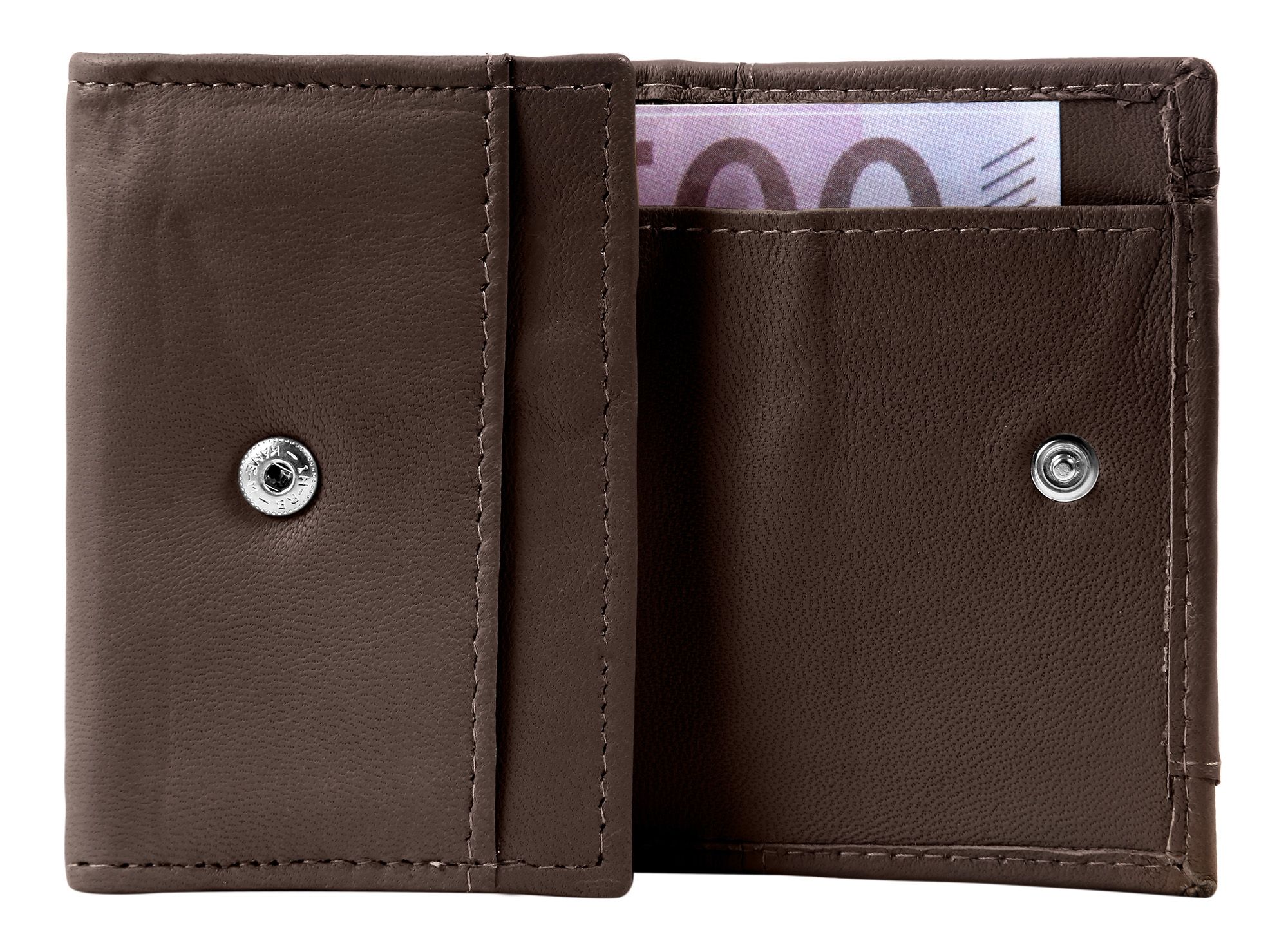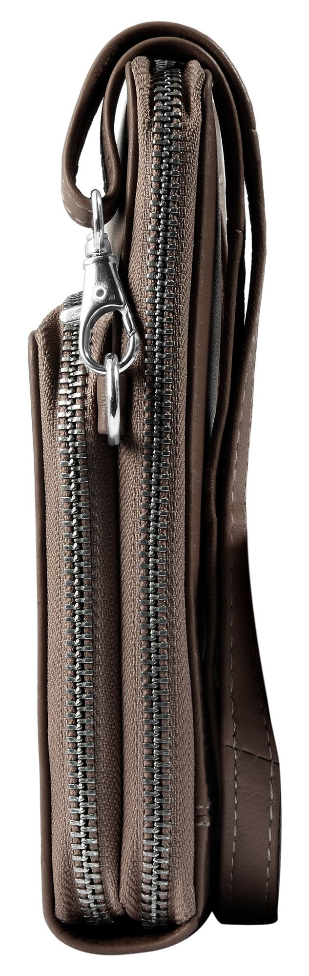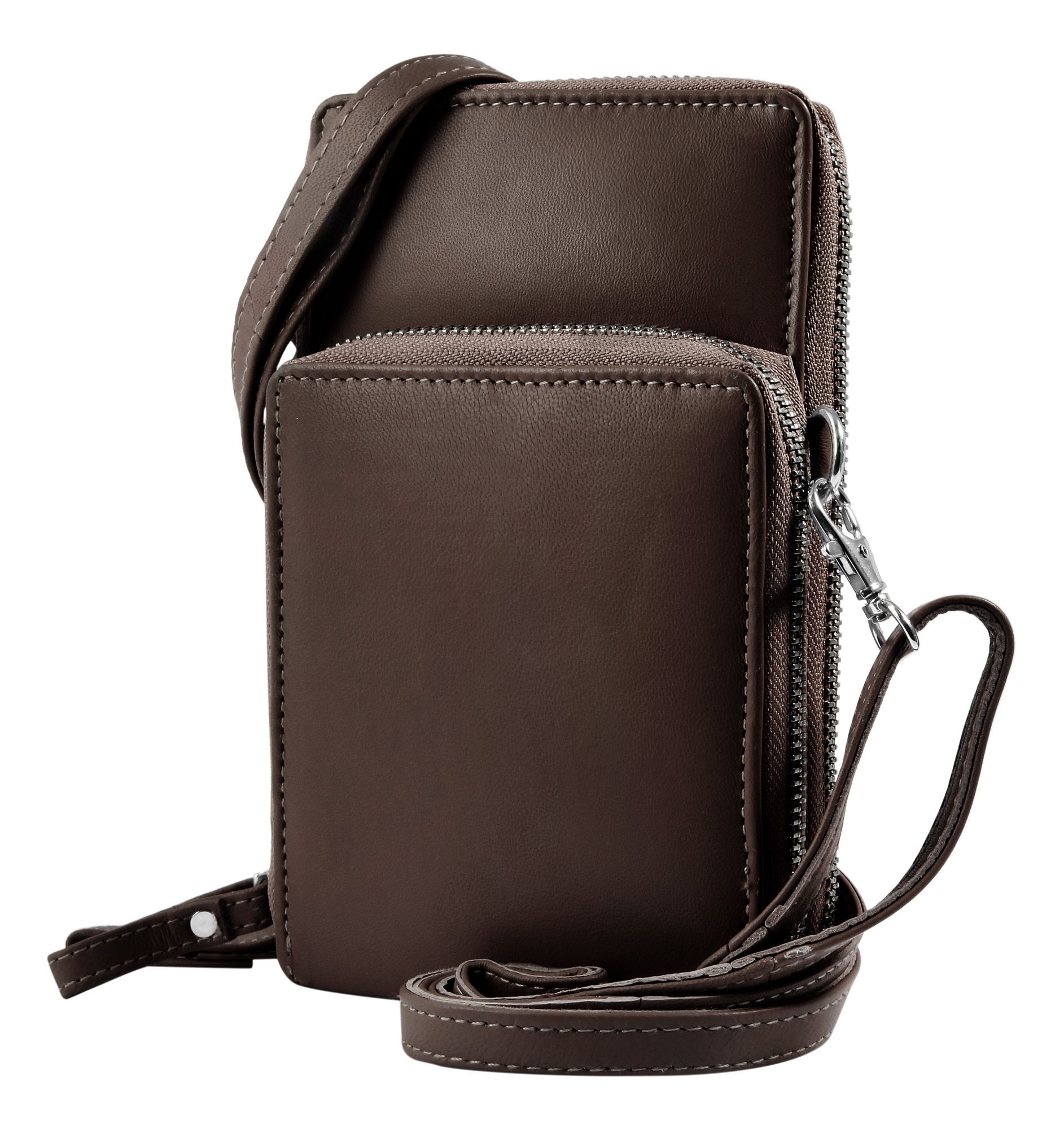 Productinformatie "Schoudertas voor mobiele telefoon van echt leer met miniportefeuille, geschikt voor iPhone 15, donkerbruin"
