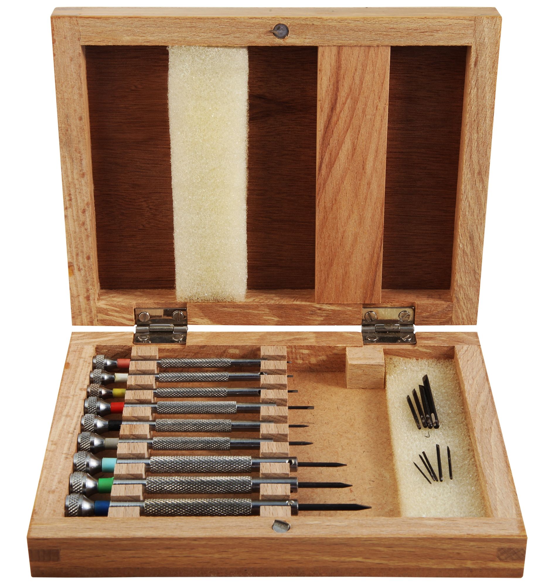 De schroevendraaierset bestaat uit negen geassorteerde sleufschroevendraaiers, die worden geleverd in een magnetisch afsluitbare houten doos. De schroevendraaiers zijn verkrijgbaar in de diktes 2,5 mm, 2,0 mm, 1,8 mm, 1,5 mm, 1,3 mm, 1,1 mm, 1,0 mm, 0,9 mm en 0,7 mm. Voor elke schroevendraaier wordt ook een reservekling meegeleverd. Schroevendraaiers zijn onmisbaar in de werkplaats van een horlogemaker. Ze zijn nodig voor het openen van horlogekasten, het inkorten van horlogebandjes en voor reparaties in en aan het uurwerk. De houten doos is 16,1 cm breed, 12,5 cm lang en 3,2 cm hoog.
