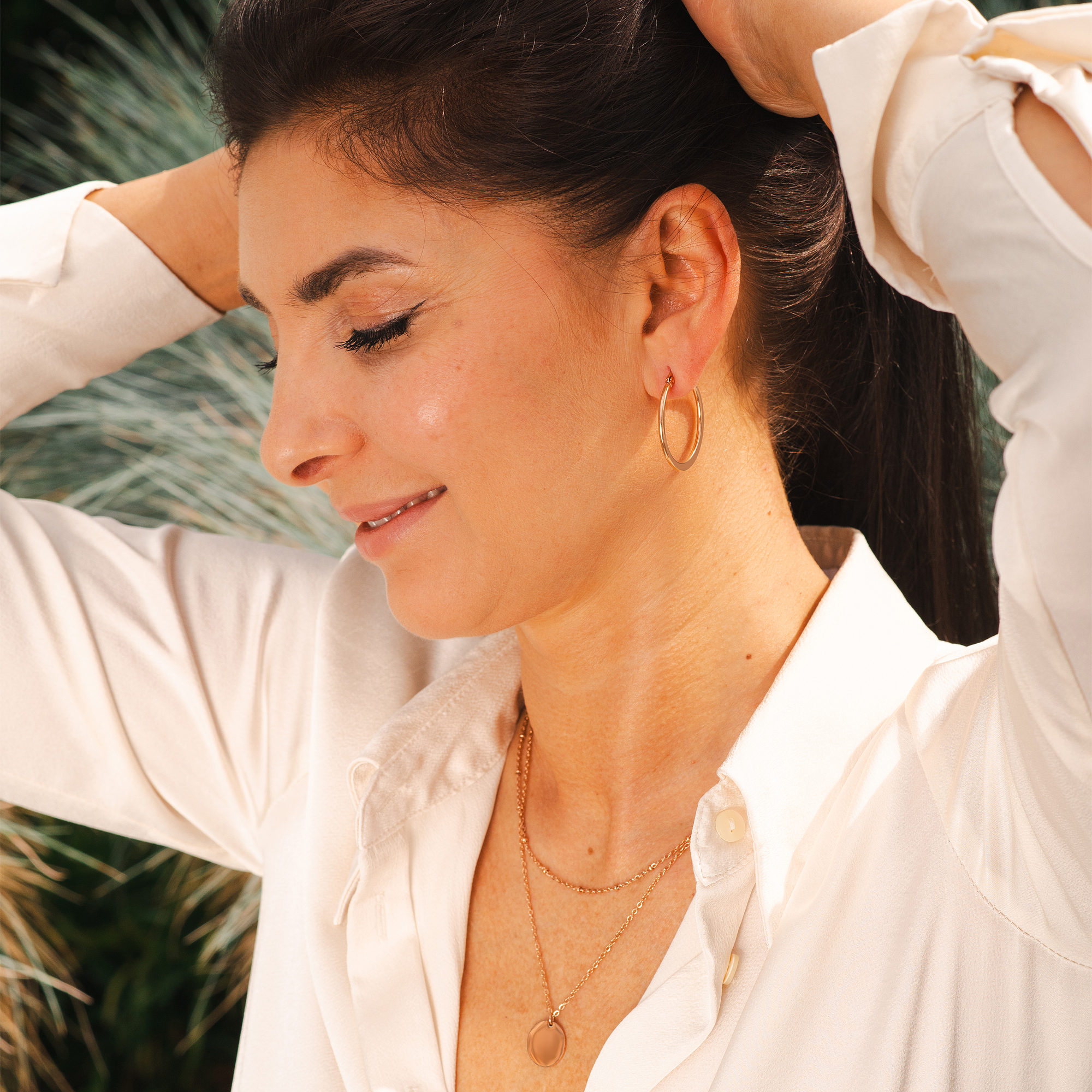 De Akzent oorbellen, bestaande uit een set van drie paar oorbellen, zijn gemaakt van roestvrij staal en zijn roségoudkleurig. Het materiaal is zeer robuust, duurzaam en ideaal voor mensen met een allergie, want roestvrij staal is bijzonder vriendelijk voor de huid. De sieraden zijn bovendien afgewerkt met een hoogwaardige ion-plating. De hoepeloorbellen zijn gepolijst en glanzen daardoor met een speciale glans. De set bestaat uit hoepeloorbellen in verschillende designs, elk met een diameter van 19 mm, 20 mm en 26 mm. Zo heb je voor elke outfit en elke gelegenheid de perfecte oorsieraden in je sieradencollectie.