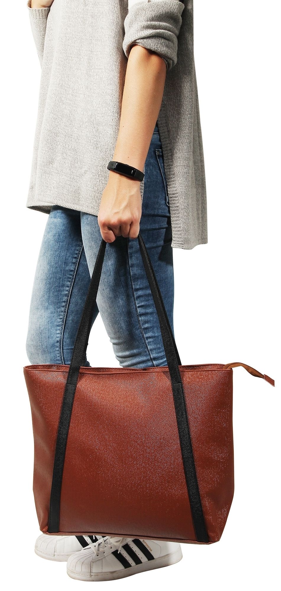 De bruine dames shopper tas is gemaakt van imitatieleer. De tas heeft twee draaghengsels en een groot hoofdvak dat kan worden geopend met een ritssluiting. Binnenin zit een smal, afsluitbaar binnenvak met een ritssluiting achter de rug. De tas is 14 cm lang, 34 cm breed en 31 cm hoog.