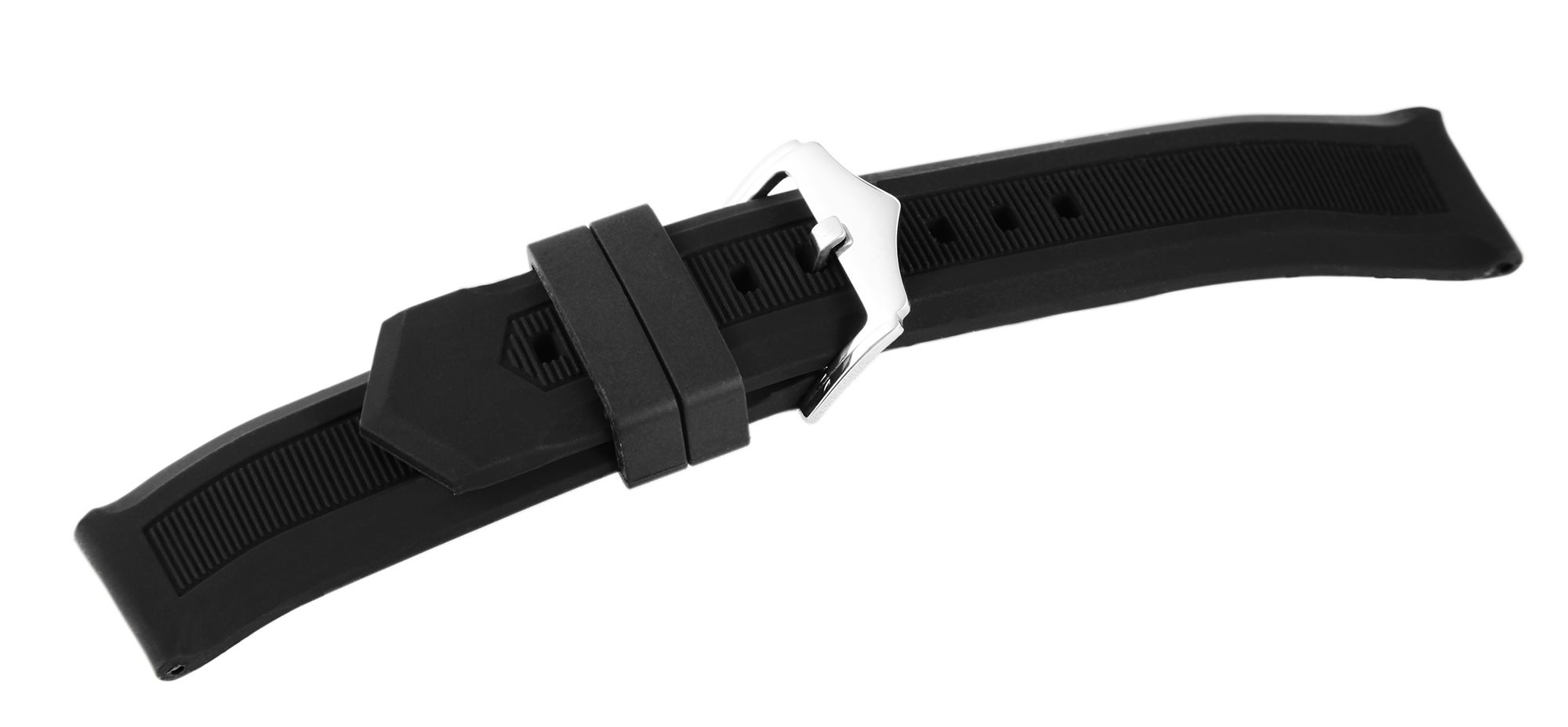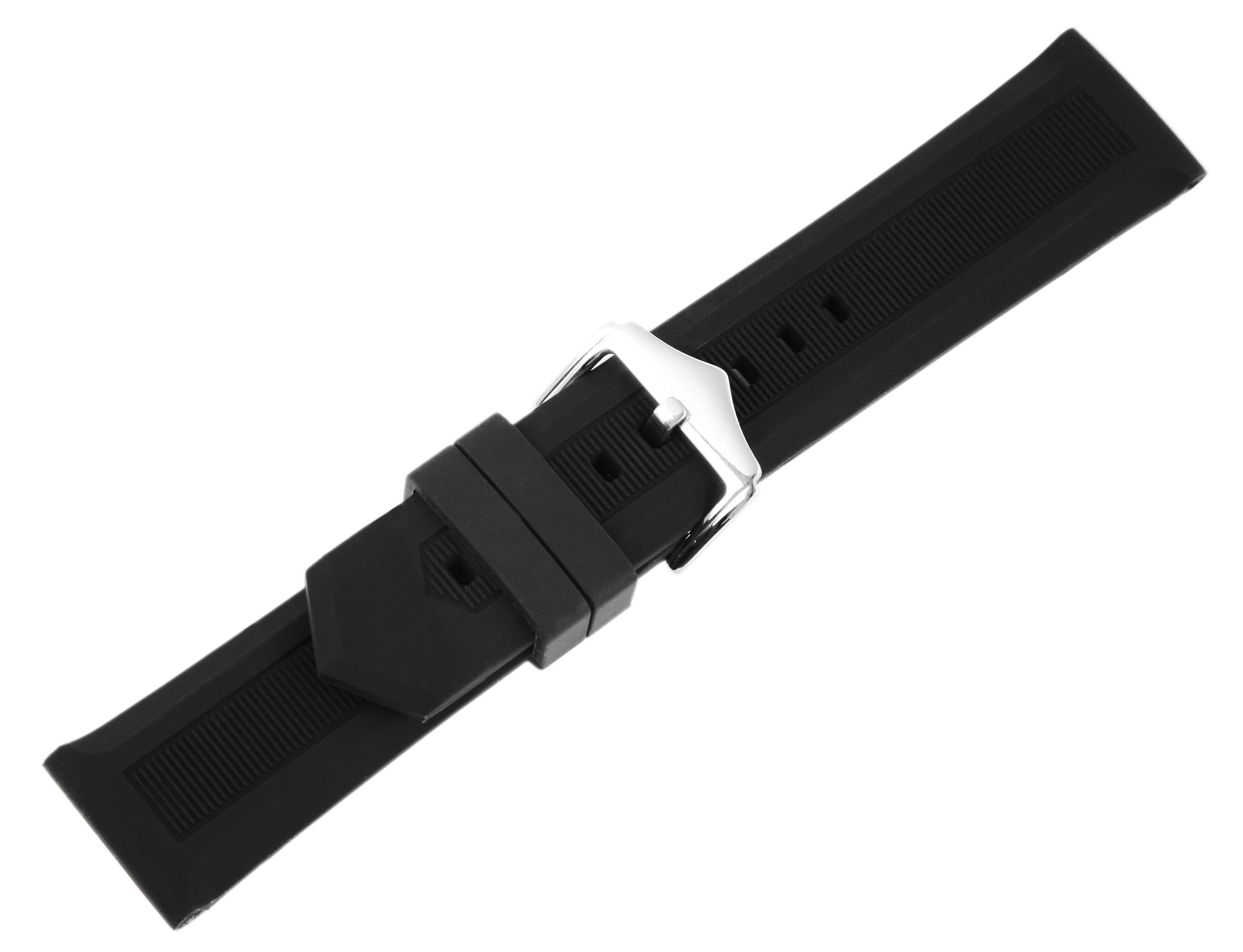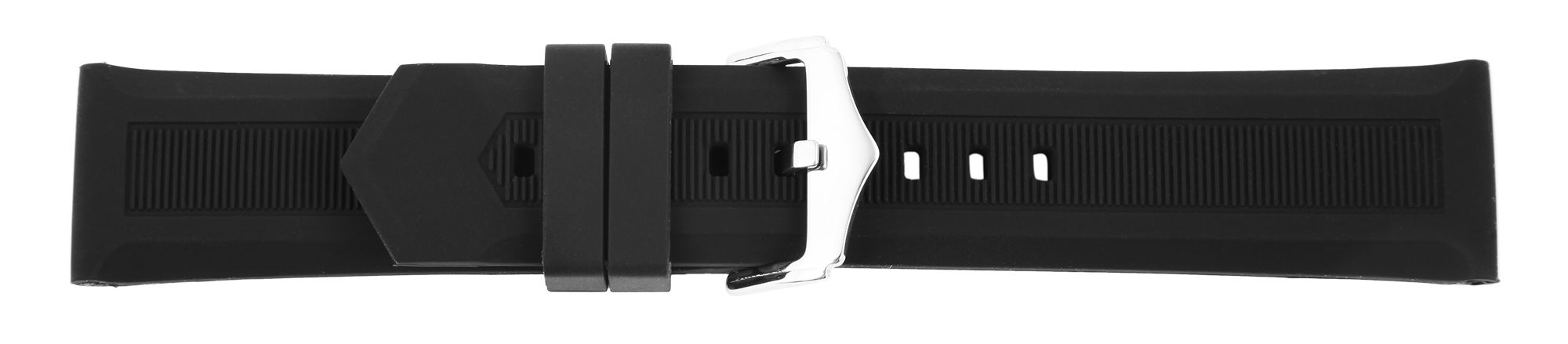 Das schwarze Uhrenarmband aus Silikon hat eine Anstoßbreite von 20 mm. Es hat eine glatte Oberfläche, die mittig mit feinen Querstreifen perforiert ist. Die Materialstärke beträgt 4 mm. Das Ersatzarmband hat eine Gesamtlänge von 21,5 cm. Das Silikonarmband lässt sich mit einer silberfarbenen Dornschließe aus Edelstahl öffnen und schließen. Der Schließenanstoß hat eine Breite von 18 mm. Das Silikonarmband bietet durch das weiche Material einen hohen Tragekomfort.