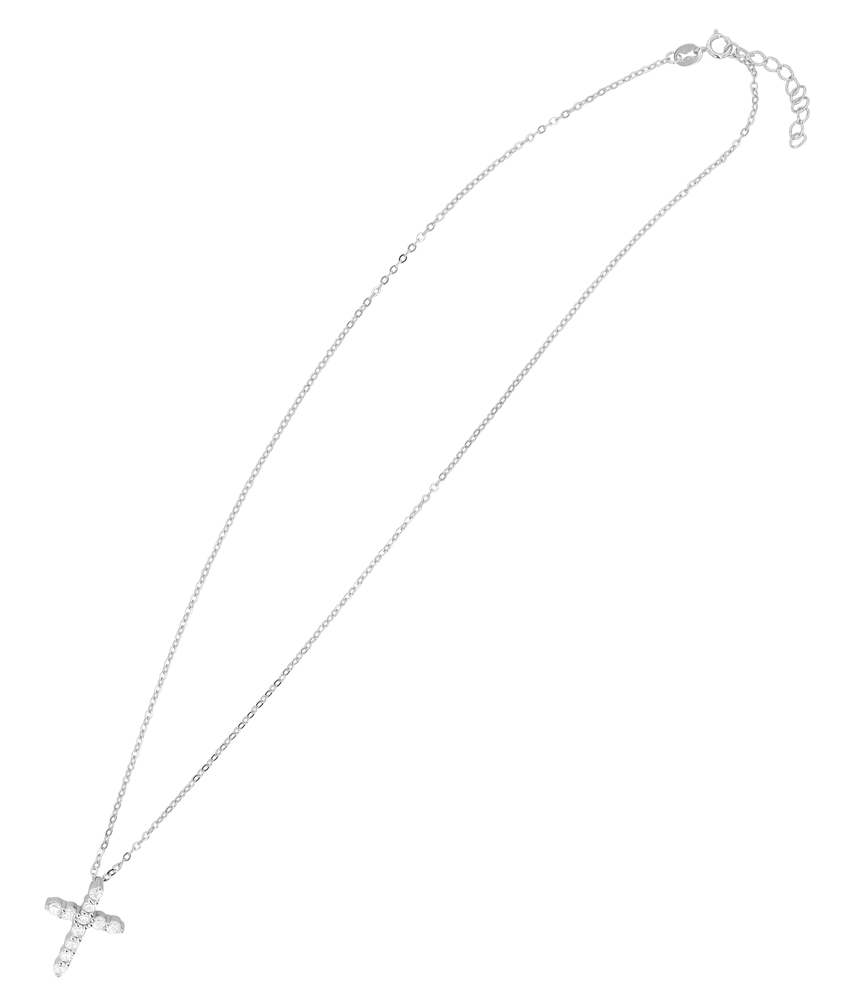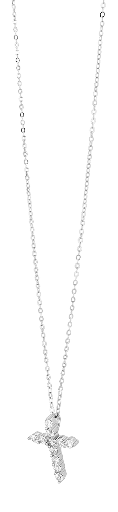 Dit elegante 925 sterling zilveren collier met een kruis hanger combineert stijlvolle esthetiek en luxe glamour. De hanger van 21 x 15 mm is versierd met 11 fonkelende zirkonia steentjes in een prongzetting, die een schitterende glans ontvouwen dankzij hun precieze zetting. De ketting heeft een lengte van 42 cm en dankzij het verlengstuk van 3 cm kan het sieraad flexibel worden aangepast aan elke halslijn en outfit. De gerhodineerde afwerking geeft het sieraad een extra elegante en langdurige bescherming die de glans na verloop van tijd behoudt.