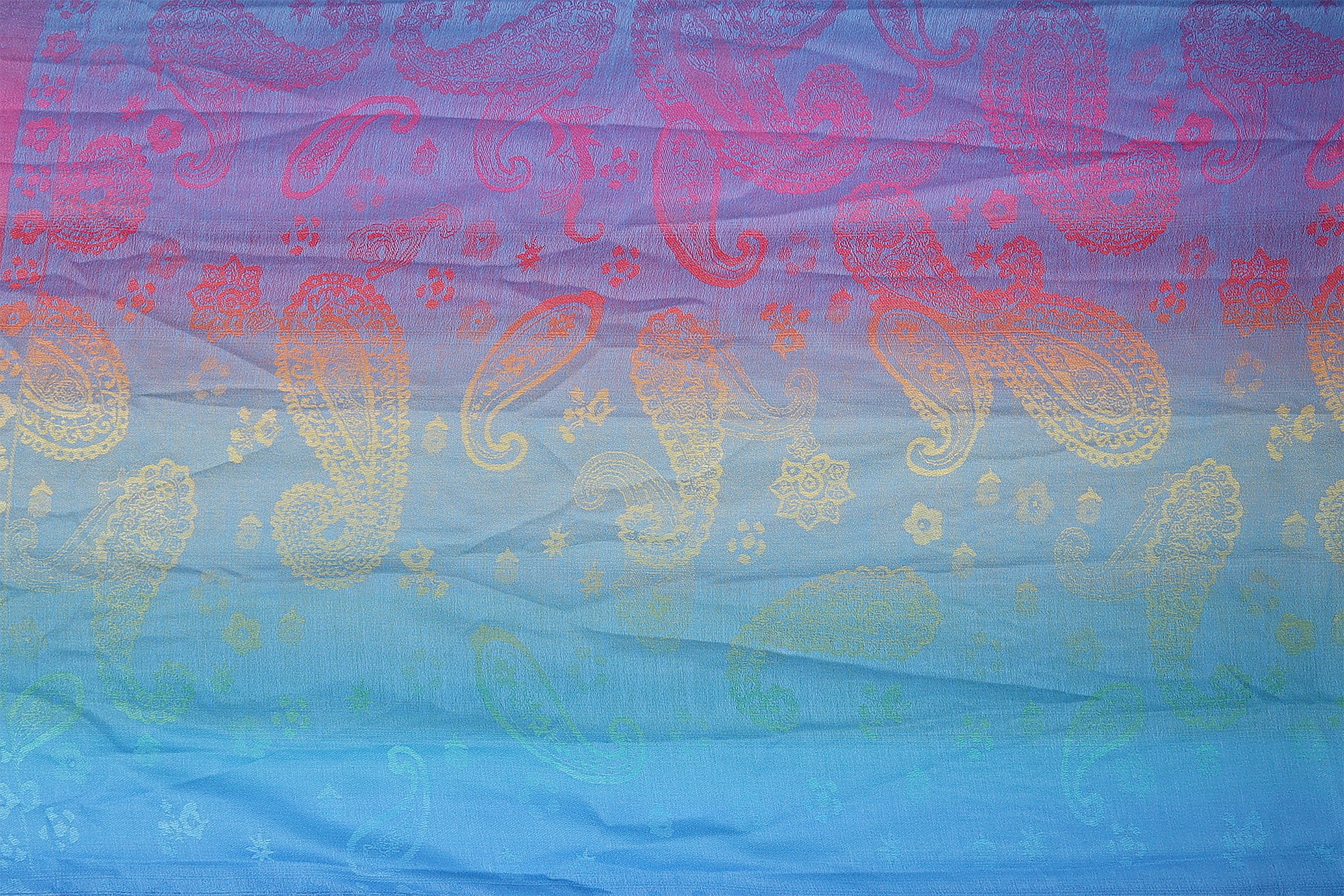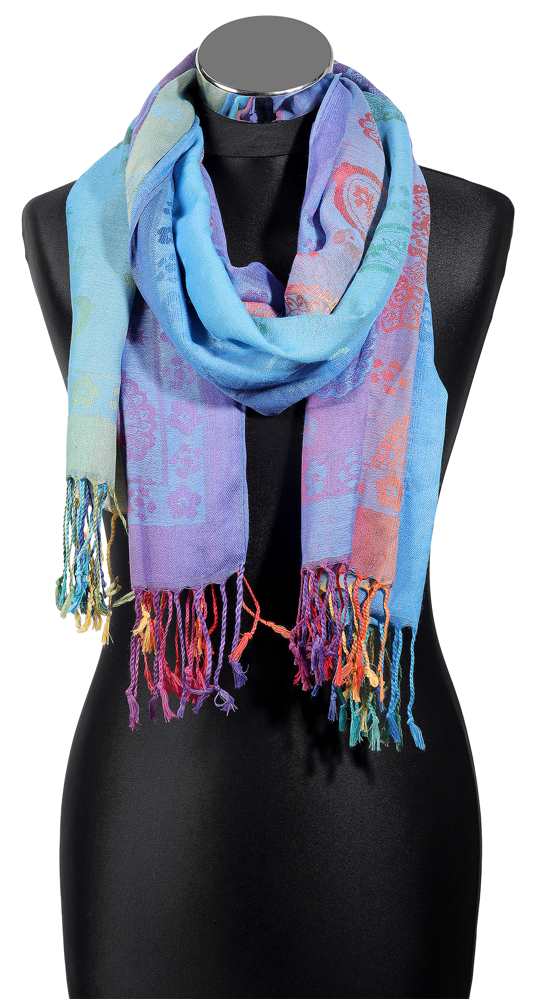 Een moderne blikvanger: dit model combineert een klassiek paisleypatroon met een vloeiend kleurverloop. Een echt statement accessoire dankzij het kleurrijke ontwerp. - Model 010 - 012(100% polyester):