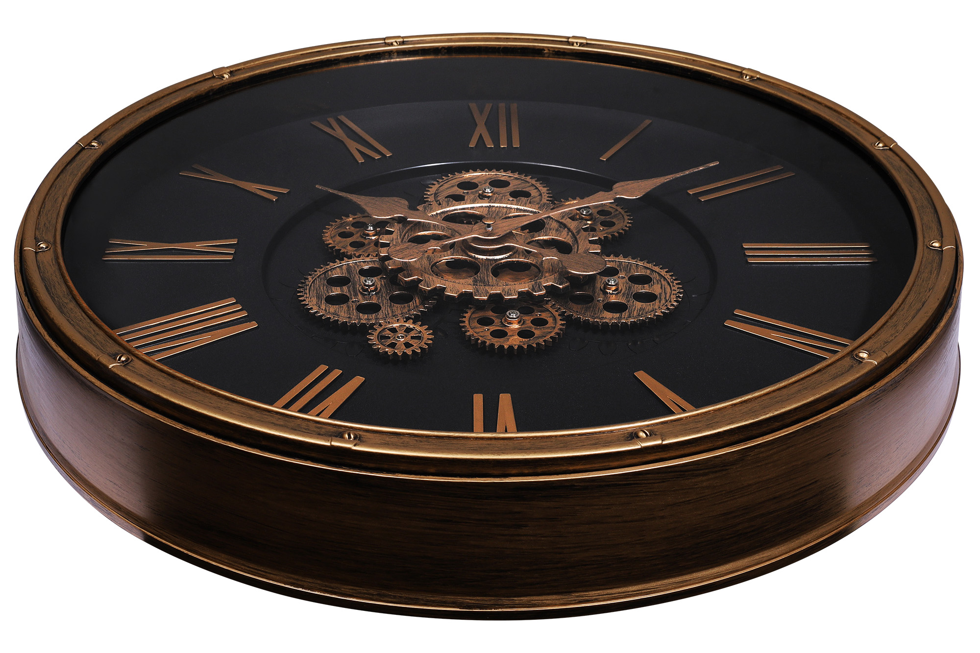 De klok is ontworpen in een klassieke skeletstijl. Het centrale ontwerpelement is het zichtbare tandwielsysteem binnenin, dat de klok een technische, bijna nostalgische charme geeft. De kleurencombinatie van geborsteld goud en vintage geeft de kast een antieke uitstraling en past perfect in een shabby chic of moderne loft-sfeer.
