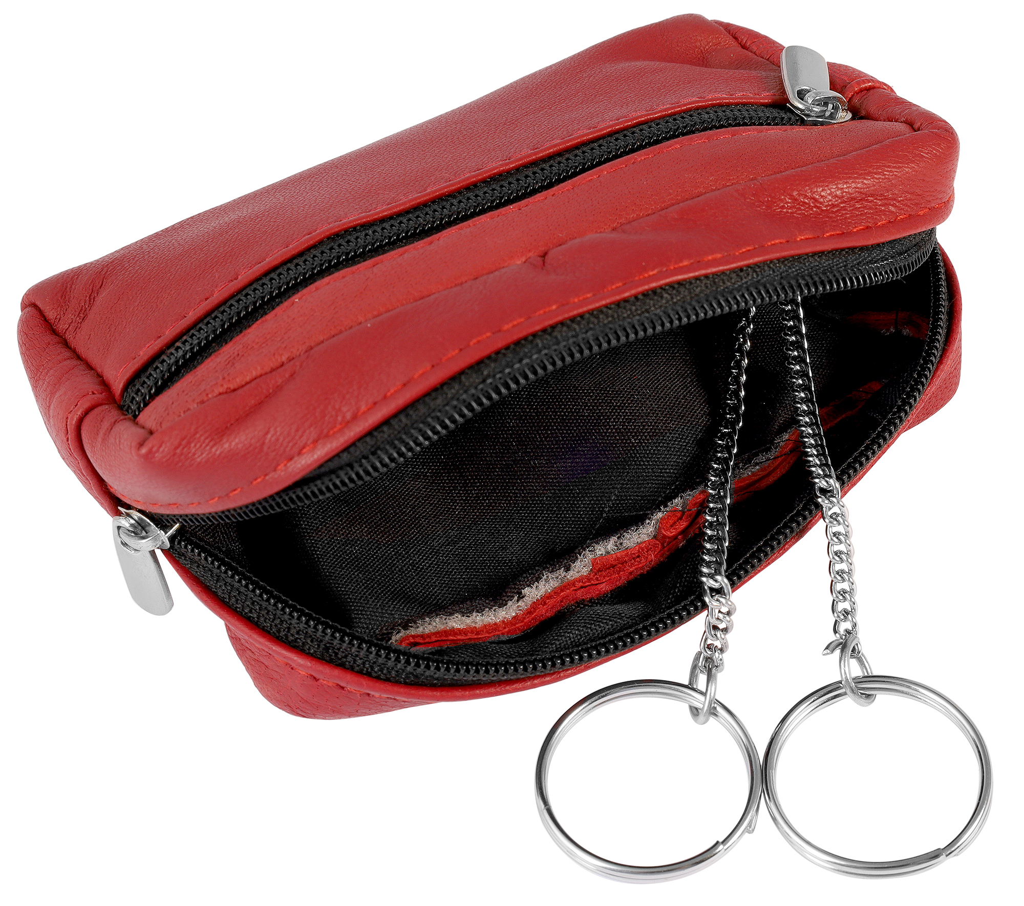 Het rode sleuteletui van het merk Excellanc is gemaakt van echt leer. De binnenvoering is van polyester. Het stiksel op het tasje, dat voor stabiliteit en ondersteuning zorgt, is ook rood. Aan het sleuteletui zijn twee praktische sleutelhangers met een diameter van 25 mm bevestigd. Deze zijn verbonden met het sleuteletui via twee 7 cm lange metalen kettingen. Ze zijn ideaal voor het bevestigen van sleutels of hangers, maar ook voor bevestiging aan tassen of sleutelhangers. Het sleuteletui heeft een groot binnenvak en een ritsvak aan de buitenkant. Het etui is 7,5 cm lang, 12,5 cm breed en 1,5 cm dik. Het sleuteletui is perfect om sleutels in op te bergen. Kleingeld en pasjes kunnen ook handig worden opgeborgen. Klein maar met een grote impact, dit klassieke sleuteletui zal zeker indruk maken.