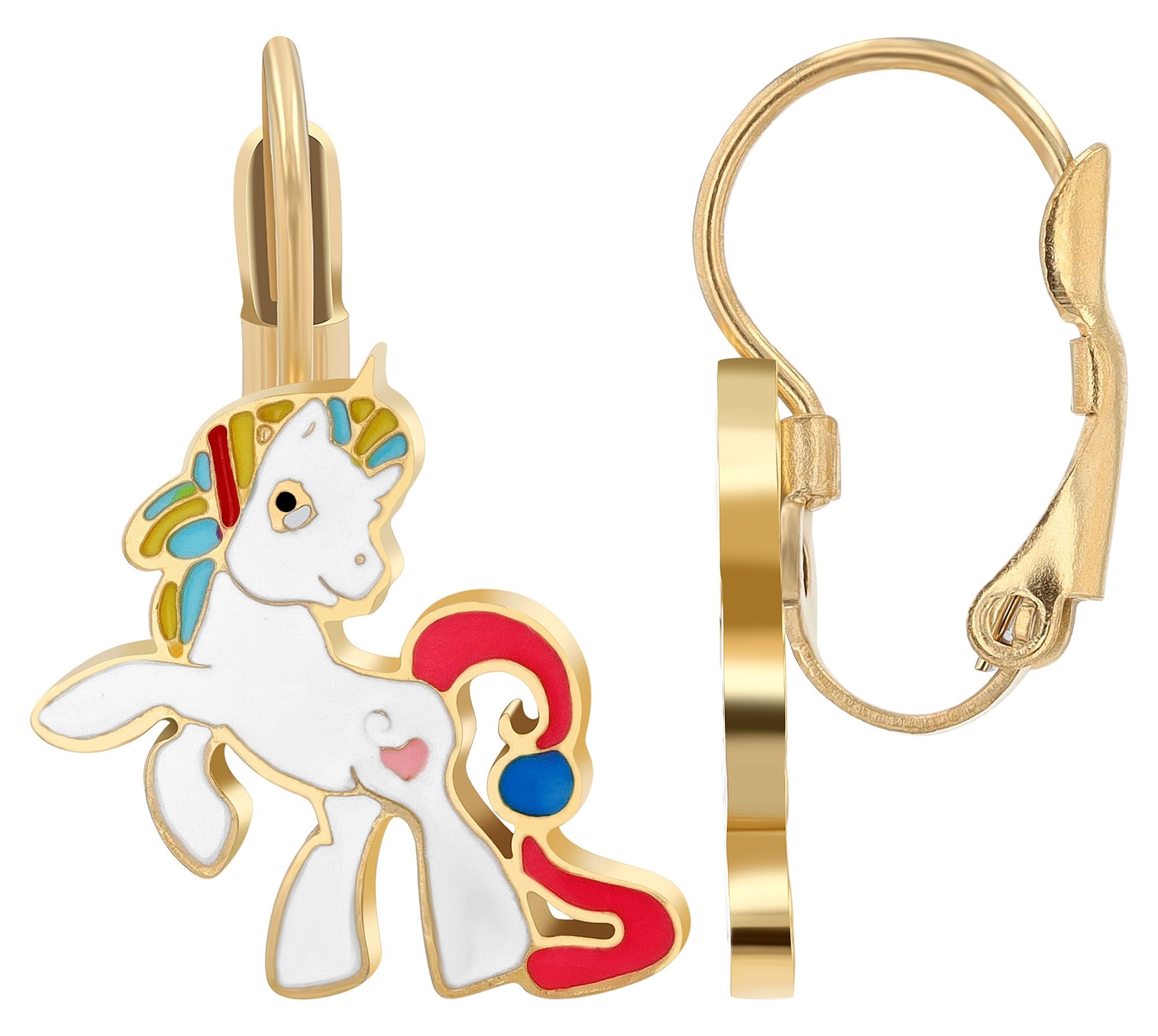 De bijpassende oorbellen zijn ook versierd met een eenhoorn en zijn 2,2 cm lang en 1,5 cm breed. Met een Weense sluiting zijn ze veilig en comfortabel te dragen zonder te knellen of te trekken.