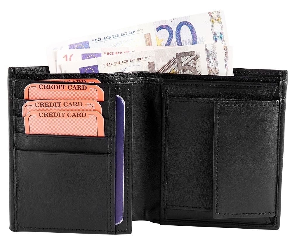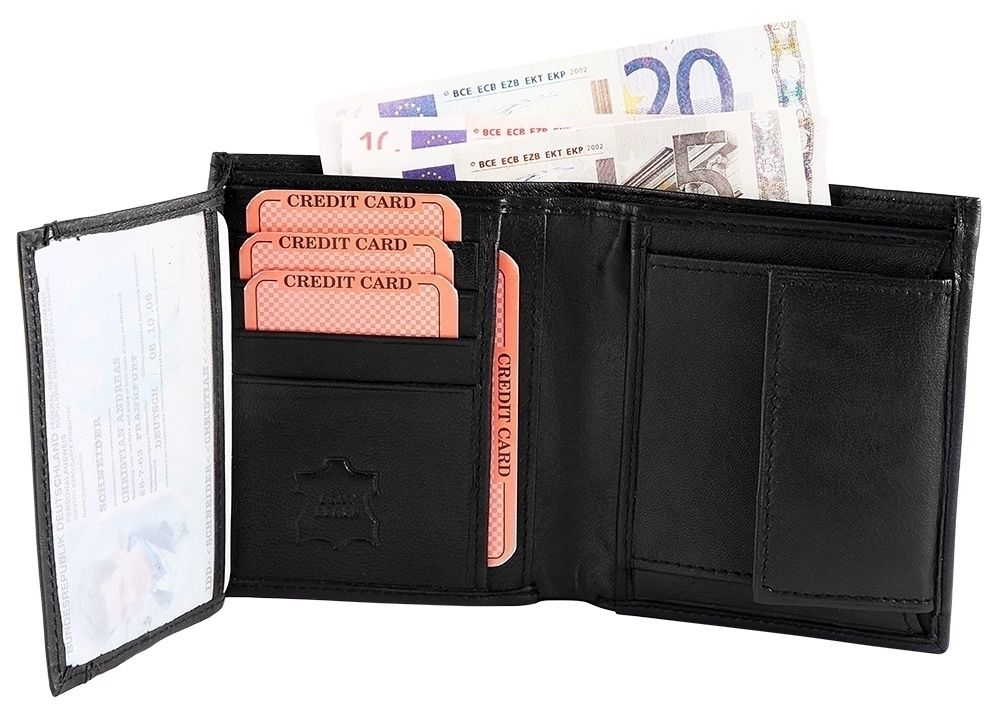 SteinMeister herenportemonnee van echt leer. De portemonnee is 10 cm breed en 11 cm hoog. De kleur is zwart. Hij heeft 2 biljetvakken, een klein kleingeldvak, 9 creditcardvakken en een transparant ID-kaartvak.