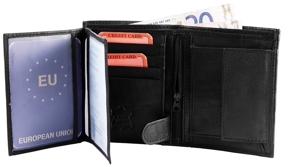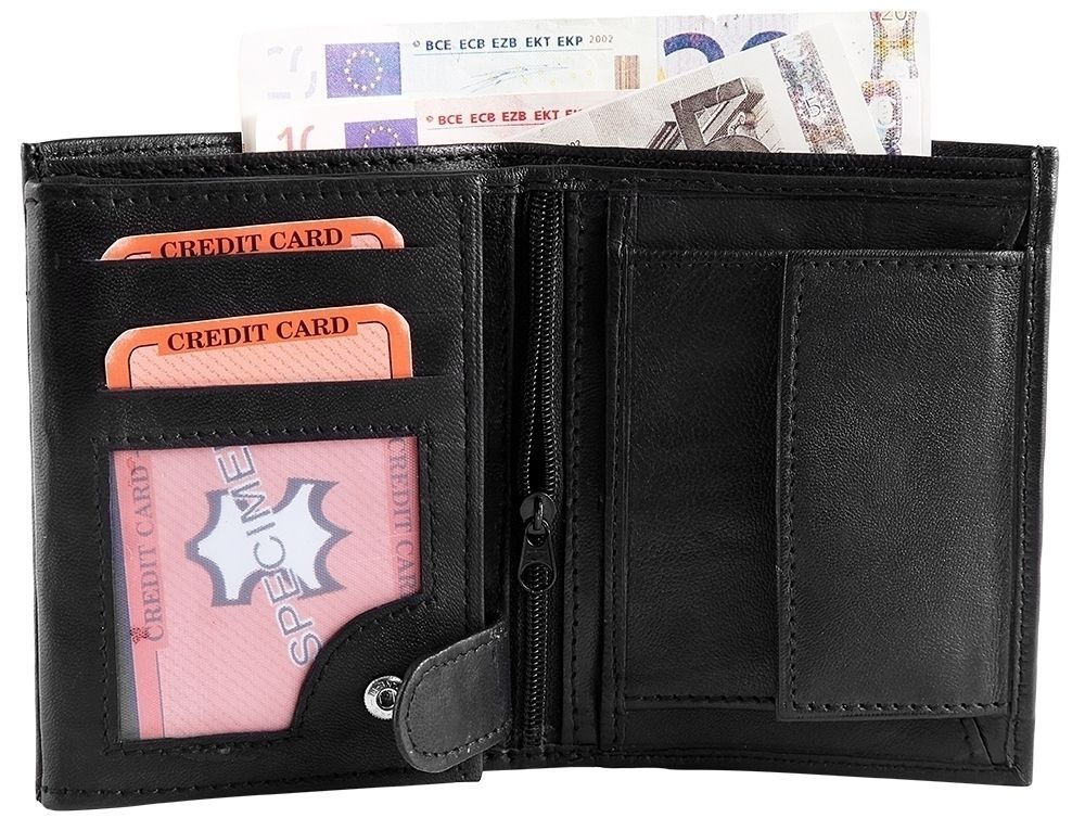 SteinMeister herenportemonnee van echt leer. De portemonnee is 10 cm breed en 12 cm hoog. De kleur is zwart. Hij heeft 2 biljetvakken, een klein kleingeldvak, 9 creditcardvakken, een transparant creditcardvak en 2 transparante ID-kaartvakken.