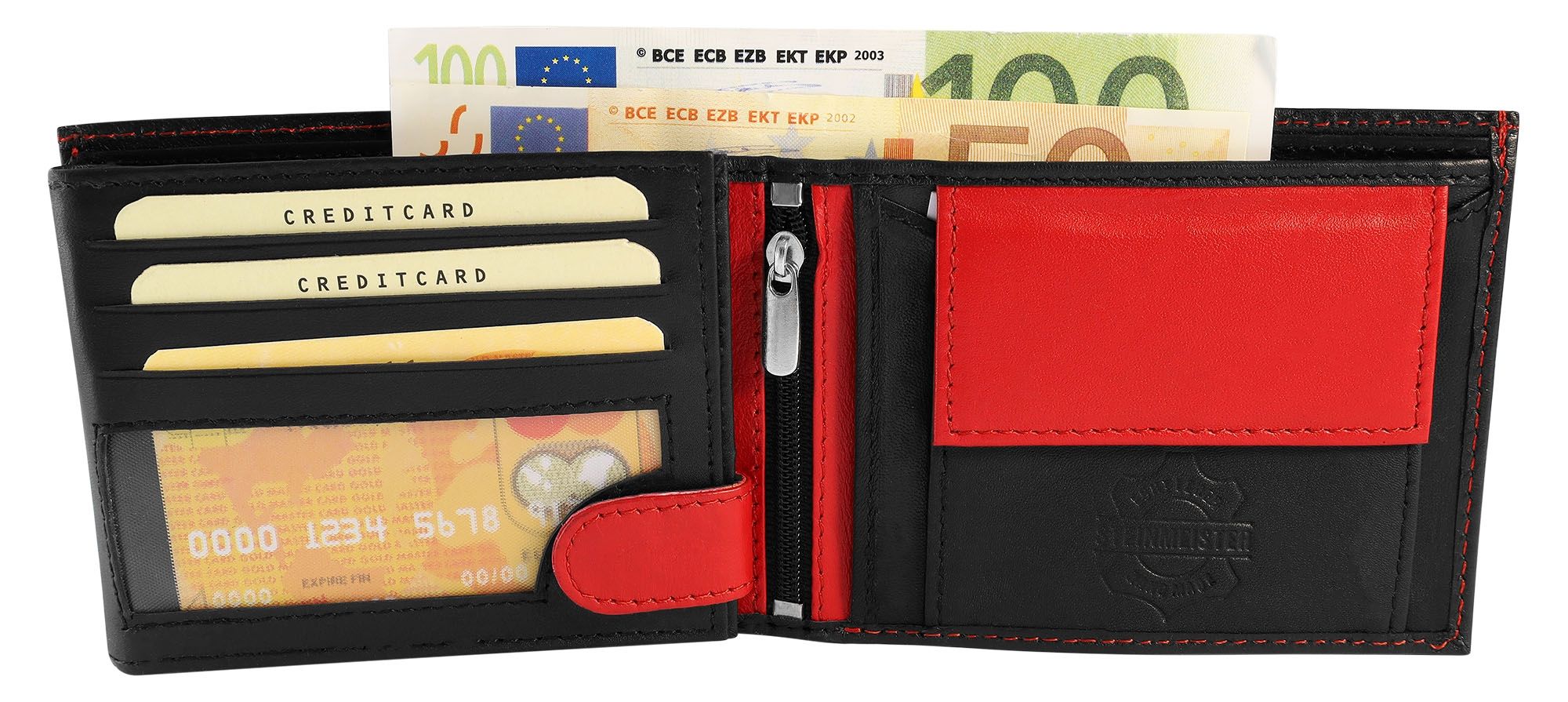 SteinMeister herenportemonnee van echt leer. De liggende portemonnee is 12 cm breed en 10 cm hoog. De kleur is zwart met rood. De echt leren portemonnee wordt gesloten met een drukknoopsluiting. Hij heeft 2 biljetvakken, een klein kleingeldvak, 10 creditcardvakjes, een transparant creditcardvak en 2 transparante ID-kaartvakken.
