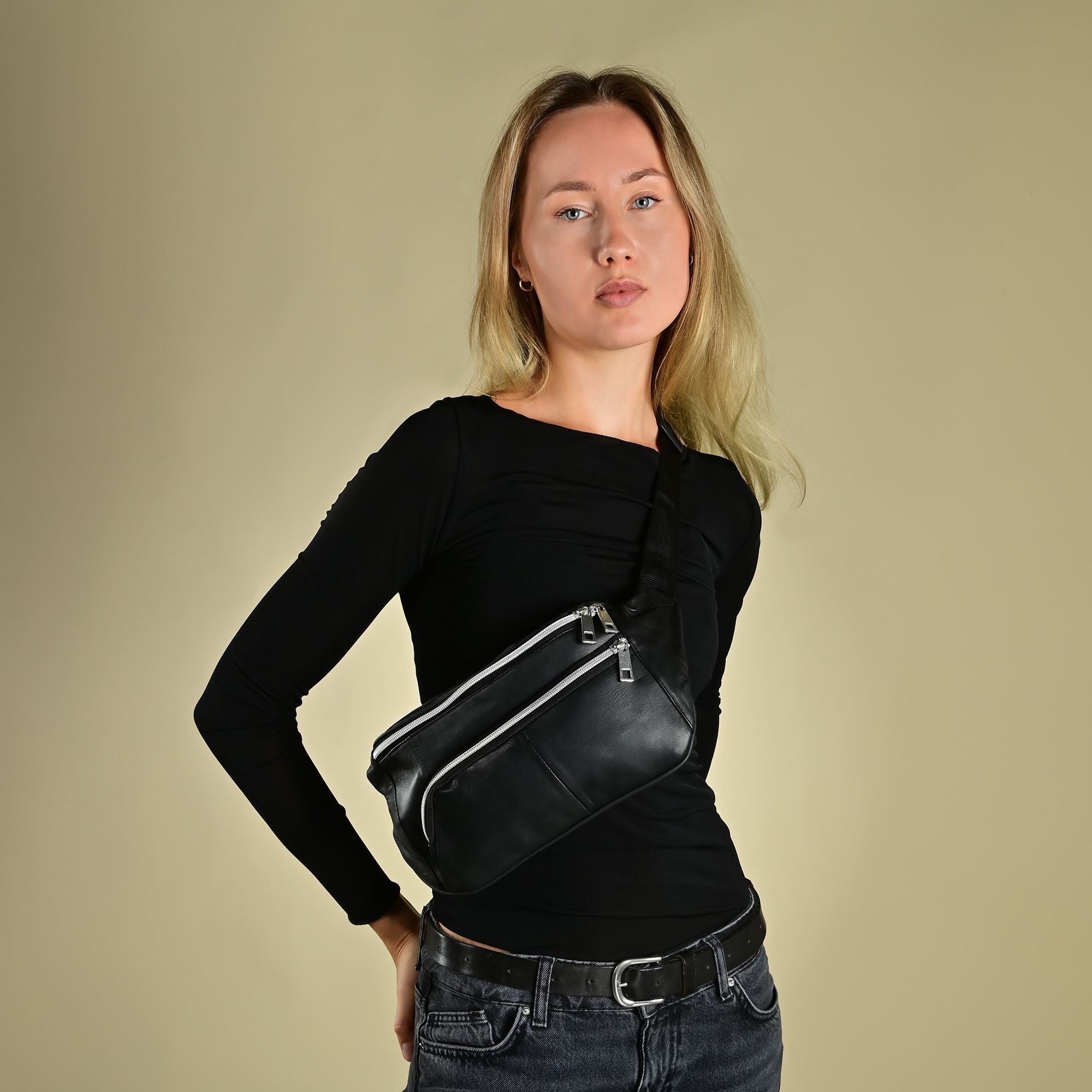 Deze modieuze heuptas van het merk Steinmeister is gemaakt van zwart echt leer en heeft een glad oppervlak. Hij zit comfortabel om de heupen met een stevige zwarte polyester heupband en kan worden geopend en gesloten met een zwarte kunststof gesp. De riem is 3 cm breed en kan worden versteld tot een minimale lengte van 60 cm en een maximale lengte van 100 cm. De heuptas heeft drie grote compartimenten die allemaal geopend kunnen worden met een rits. Het middelste hoofdvak kan aan beide zijden worden geopend met een dubbel lipje. Het tweede voorvak is iets dieper en loopt iets af naar beneden. Het derde compartiment bevindt zich aan de achterkant en biedt voldoende ruimte voor waardevolle spullen die tijdens het dragen dicht op het lichaam zitten. De afmetingen van de modieuze heuptas zijn 17 cm lang, 37 cm breed en 1,5 cm diep.
