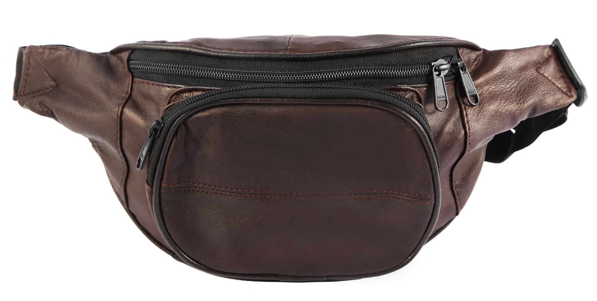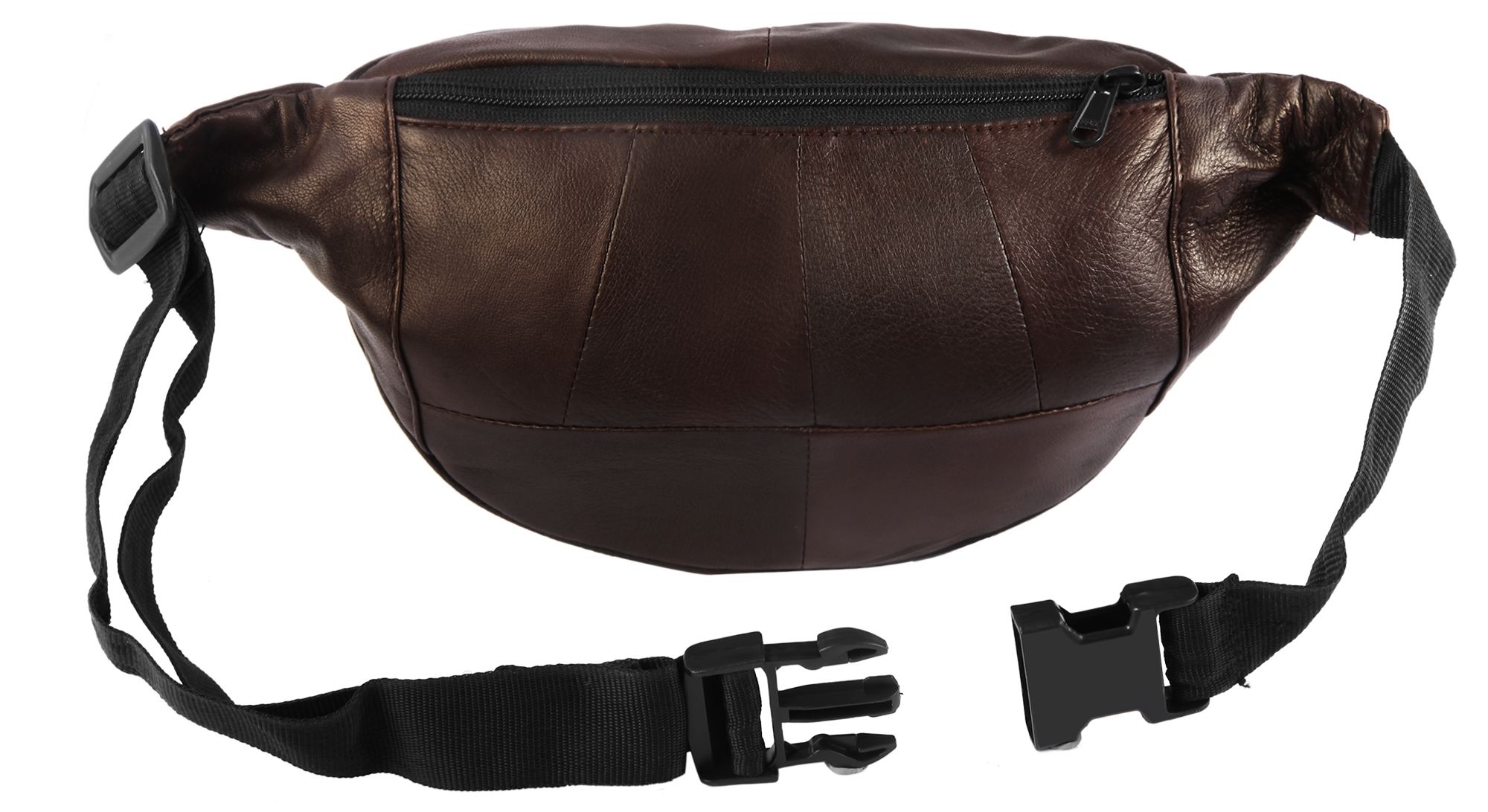Deze modieuze heuptas van het merk Steinmeister is gemaakt van bruin echt leer en heeft een glad oppervlak. Hij zit comfortabel om de heupen met een stevige zwarte polyester heupband en kan worden geopend en gesloten met een zwarte kunststof gesp. De riem is 3 cm breed en kan worden versteld tot een minimale lengte van 60 cm en een maximale lengte van 100 cm. De heuptas heeft drie grote compartimenten die allemaal geopend kunnen worden met een zwarte ritssluiting. Het middelste hoofdvak kan aan beide zijden worden geopend met een dubbel lipje. Het tweede voorvak is iets dieper, ovaal en iets kleiner dan het hoofdvak. Het derde compartiment bevindt zich aan de achterkant en biedt voldoende ruimte voor waardevolle spullen die tijdens het dragen dicht op het lichaam zitten. De afmetingen van het modieuze heuptasje zijn 17 cm lang, 33 cm breed en 3 cm diep.