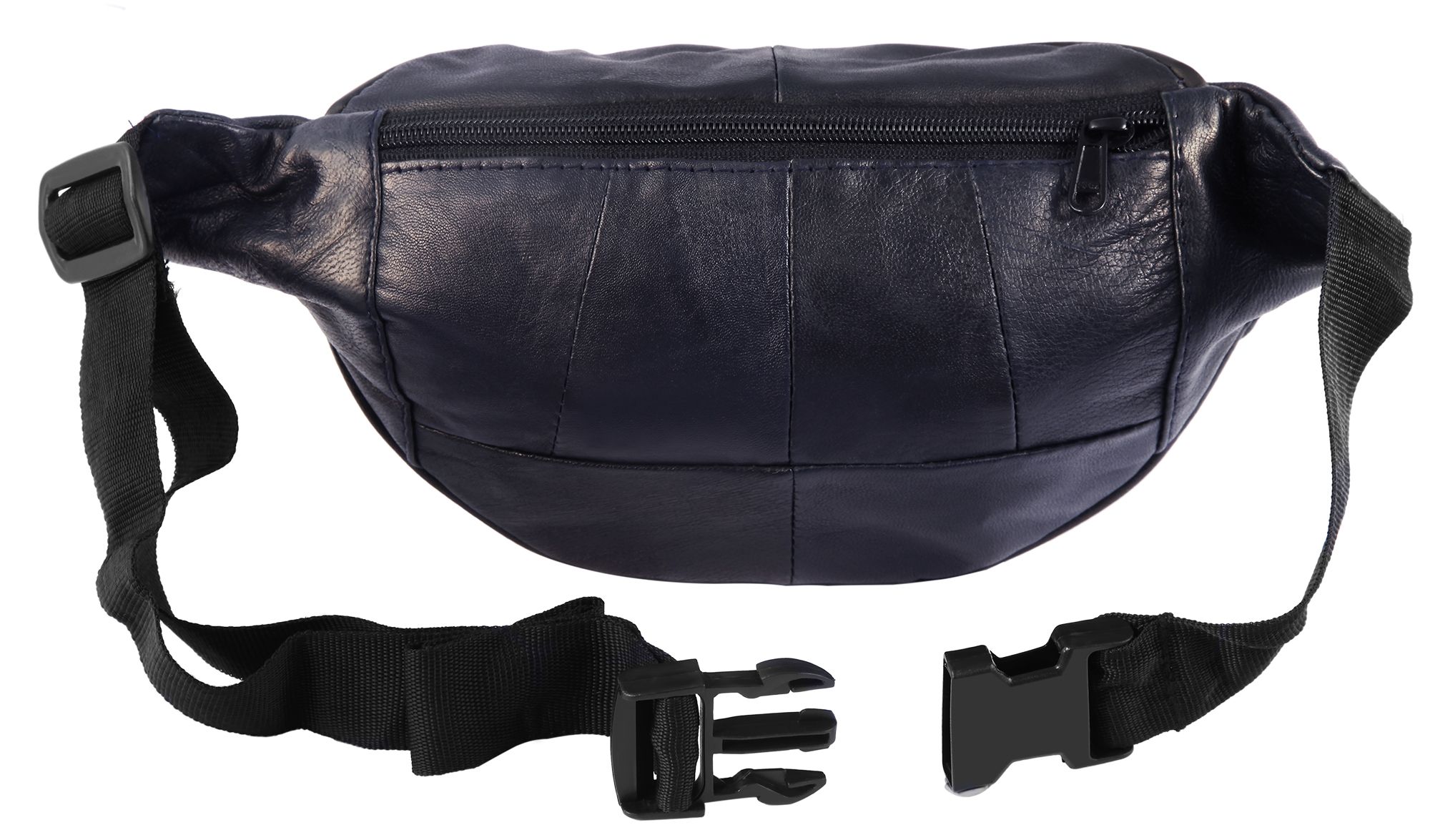 Deze modieuze heuptas van het merk Steinmeister is gemaakt van donkerblauw echt leer en heeft een glad oppervlak. Hij zit comfortabel om de heupen met een stevige zwarte polyester heupband en kan worden geopend en gesloten met een zwarte kunststof gesp. De riem is 3 cm breed en kan worden versteld tot een minimale lengte van 60 cm en een maximale lengte van 100 cm. De heuptas heeft drie grote compartimenten die allemaal geopend kunnen worden met een zwarte ritssluiting. Het middelste hoofdvak kan aan beide zijden worden geopend met een dubbel lipje. Het tweede voorvak is iets dieper, ovaal en iets kleiner dan het hoofdvak. Het derde compartiment bevindt zich aan de achterkant en biedt voldoende ruimte voor waardevolle spullen die tijdens het dragen dicht op het lichaam zitten. De afmetingen van het modieuze heuptasje zijn 17 cm lang, 33 cm breed en 3 cm diep.