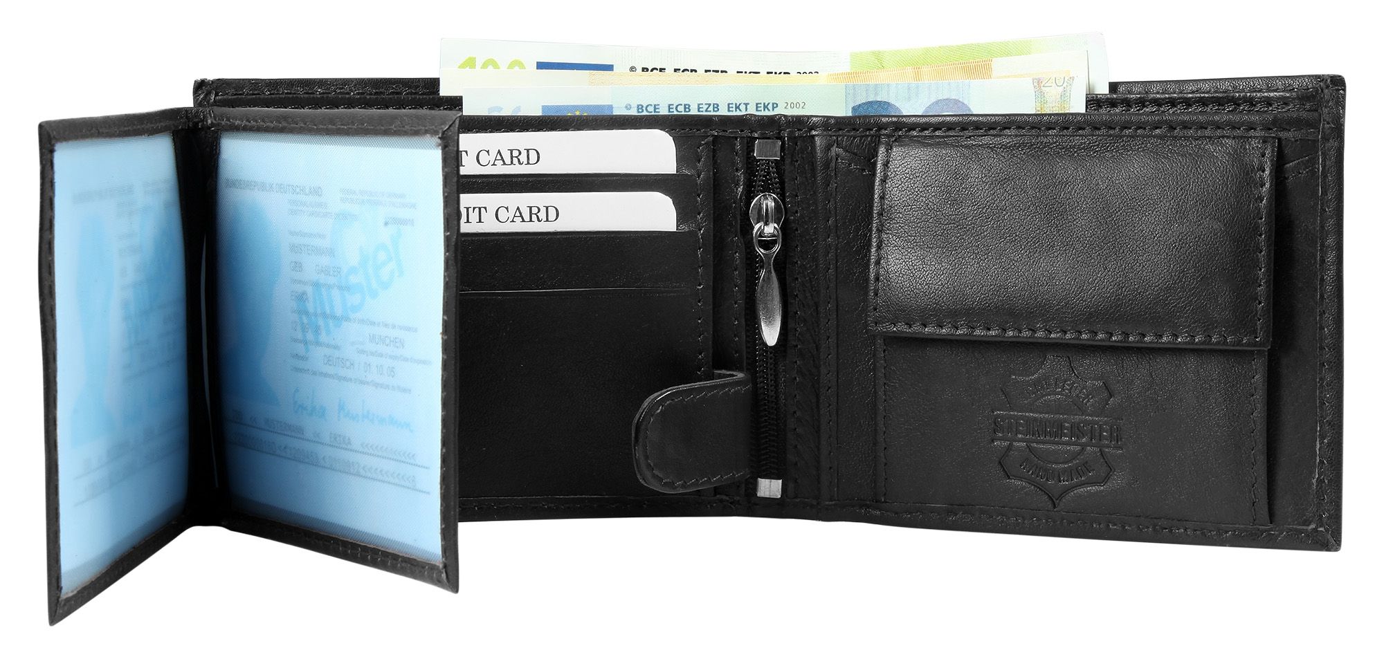 De herenportemonnee van het merk Steinmeister is gemaakt van echt lamsleer in liggend formaat en heeft een glad oppervlak. Het leer voelt bijzonder zacht en soepel aan. De portemonnee is een echte ruimtebespaarder en biedt veel opbergruimte voor alle belangrijke documenten. De portemonnee is verdeeld in acht creditcardvakjes, twee biljetvakken, een muntvak met verdeler en boodschappenchipvak, twee transparante ID-kaartvakken, twee steekvakken en een ritsvak. De pasjes zijn beveiligd met een drukknoop. De portemonnee is 9,1 cm lang, 11,7 cm breed en 3 cm hoog.