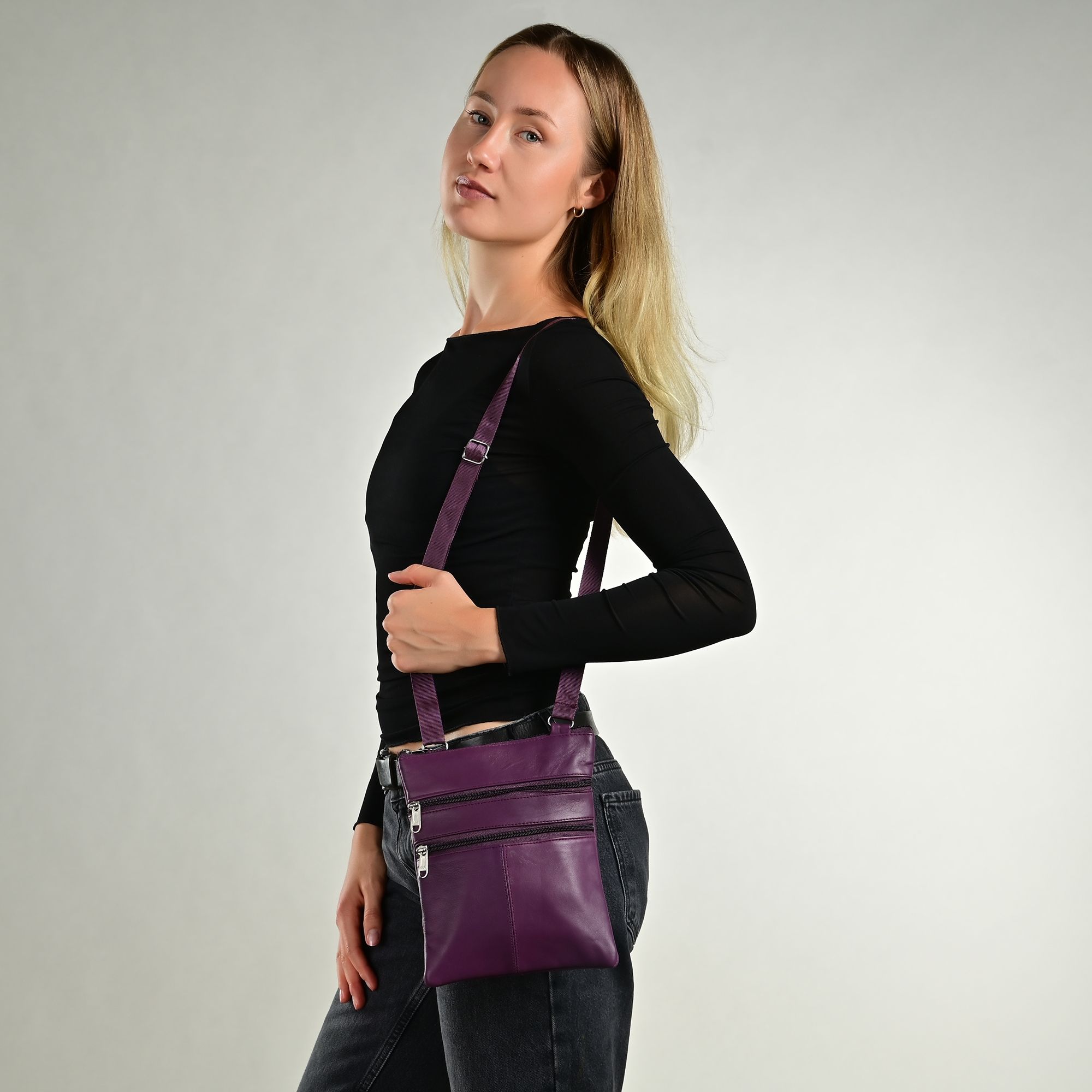 De donkerpaarse dameshandtas van Steinmeister is gemaakt van echt leer en heeft een glad oppervlak. De tas heeft een lang donkerpaars draaghengsel dat kan worden uitgeschoven tot een maximale lengte van 130 cm. Het handvat is aan beide zijden aan de tas bevestigd met 2 metalen oogjes. Het middelste hoofdvak van de tas kan worden geopend en gesloten met een rits. Er zijn ook twee buitenvakken aan de voorkant van de handtas, die ook toegankelijk zijn via een rits. Er is ook een groot buitenvak aan de achterkant van het modeaccessoire, dat ook geopend en gesloten kan worden met een ritssluiting. Alle ritsen zijn ook donkerpaars. De handtas is 23 cm lang, 18 cm breed en 1,5 cm diep. Een modieuze handtas die superpraktisch is door het relatief kleine formaat.