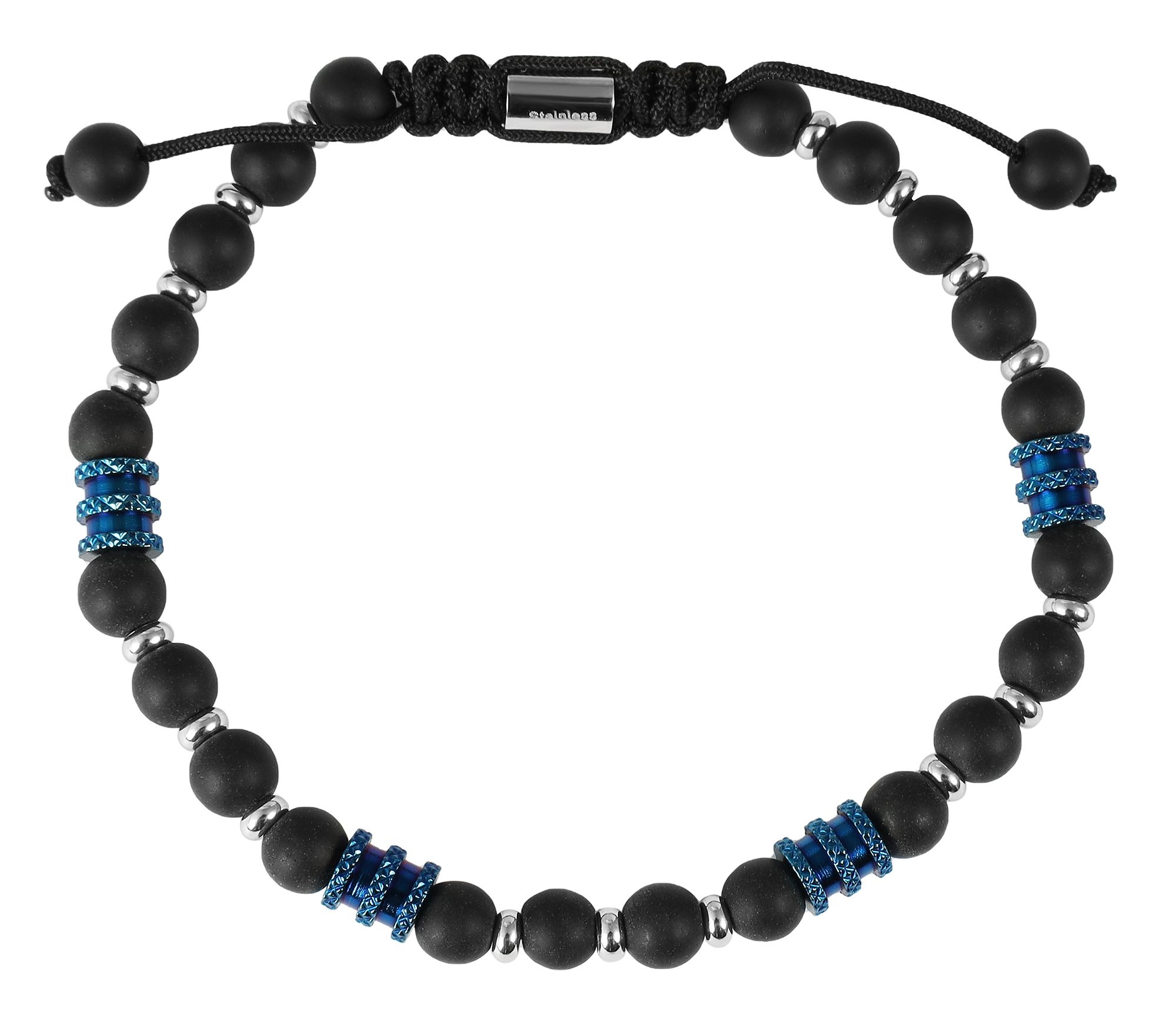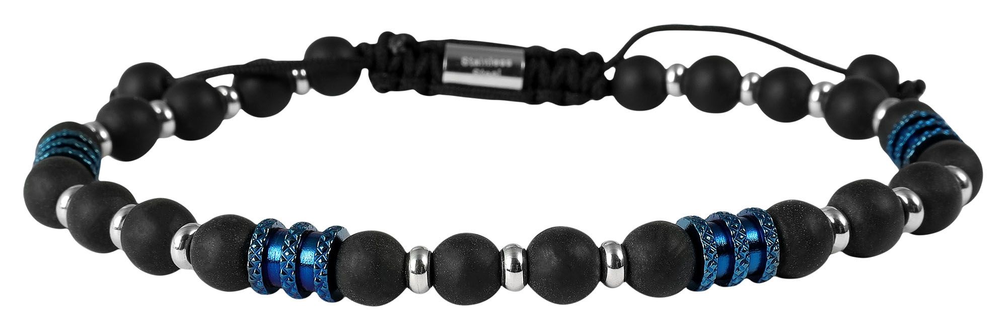 De armband is versierd met 6 mm onyxkralen, die indruk maken met hun diepzwarte, matglanzende look en hem een discreet elegante touch geven. De zorgvuldig verwerkte roestvrijstalen elementen in goud, zilver, blauw of zwart geven de armband een extra robuuste charme en zorgen voor subtiele contrasten. Dankzij de praktische schuifknoop kan de armband worden verlengd van 19 cm tot maximaal 25 cm en past daardoor perfect om elke pols.