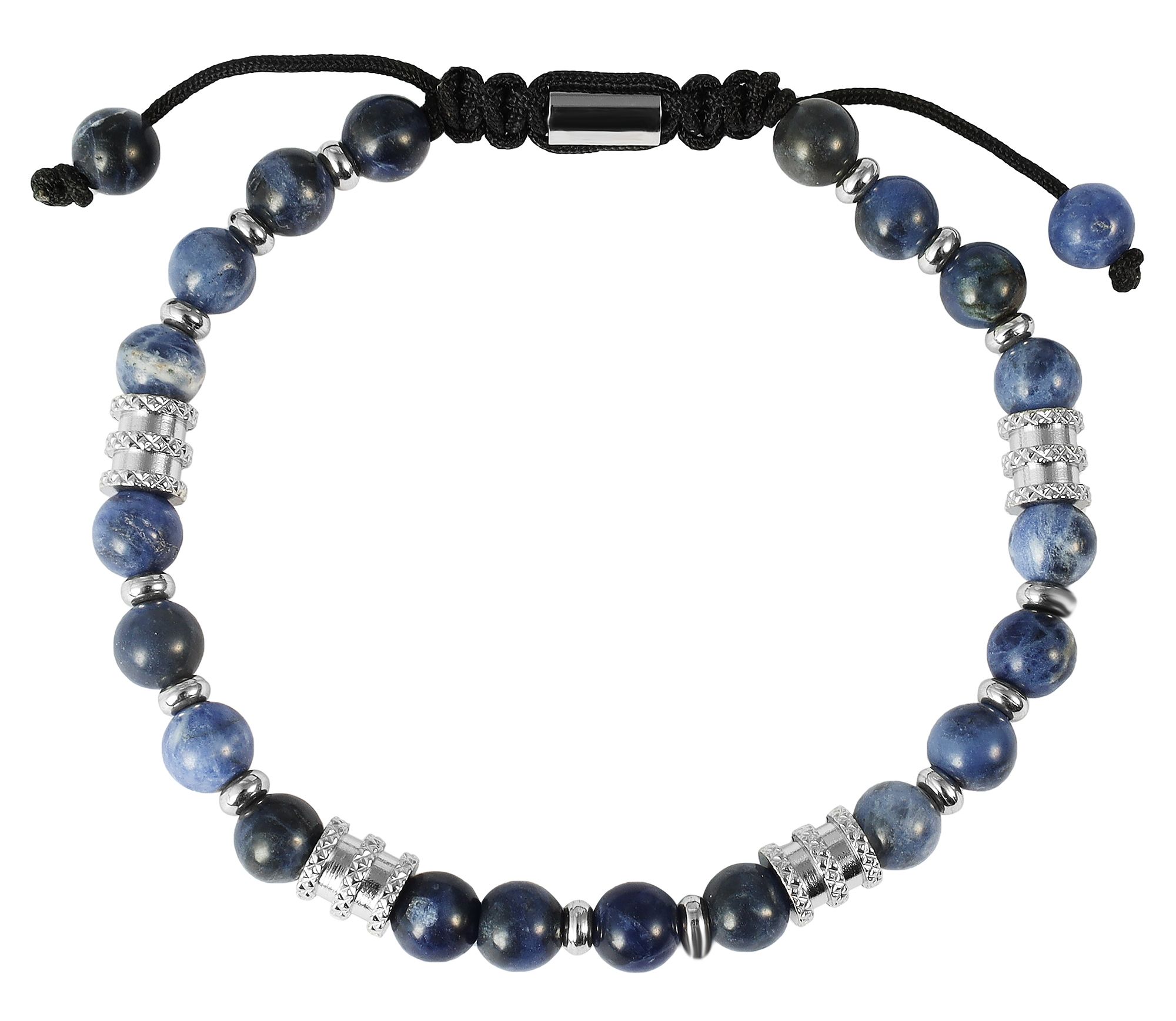 "Svend" - Bolvormige armband met natuursteen "sodaliet" en roestvrijstalen elementen De "Svend" armband bestaat uit 6 mm grote natuurstenen bollen, die verkrijgbaar zijn in drie indrukwekkende variaties: diepblauwe sodaliet, elegante zwarte onyx en fascinerende bruine tijgeroog. Elk van deze varianten geeft de armband een unieke esthetiek en maakt het een veelzijdige metgezel voor elke gelegenheid.