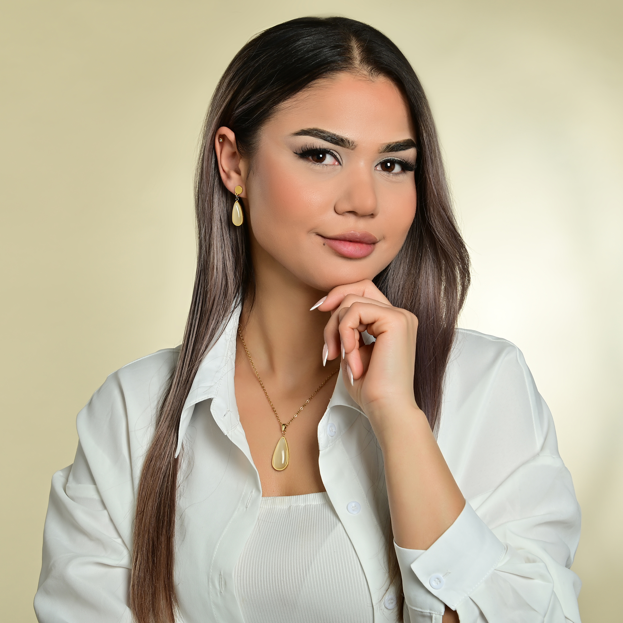 De ketting, die 45 cm lang is, wordt stevig vastgemaakt met een karabijnsluiting. De focus ligt op de druppelvormige hanger die aan de ketting bungelt. Deze hanger is versierd met steentjes en meet royaal 32 x 14,5 x 5,5 mm. De bijpassende oorbellen zijn ook ontworpen met druppelvormige elementen. Het bijzondere aan deze oorbellen is hun flexibiliteit, die elegant meezwaait met elke beweging van de draagster. Met een totale lengte van 35 mm, een breedte van 11 mm en een dikte van 4,5 mm bieden ze harmonieuze proporties. Ze worden vastgezet met een vleugelschroef en een extra oormoer met een siliconen plaatje, die niet alleen stevig vastzit, maar ook comfortabel is om te dragen.