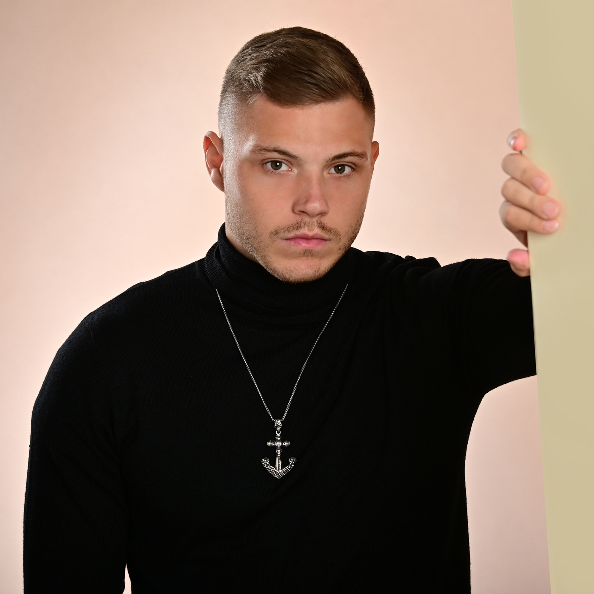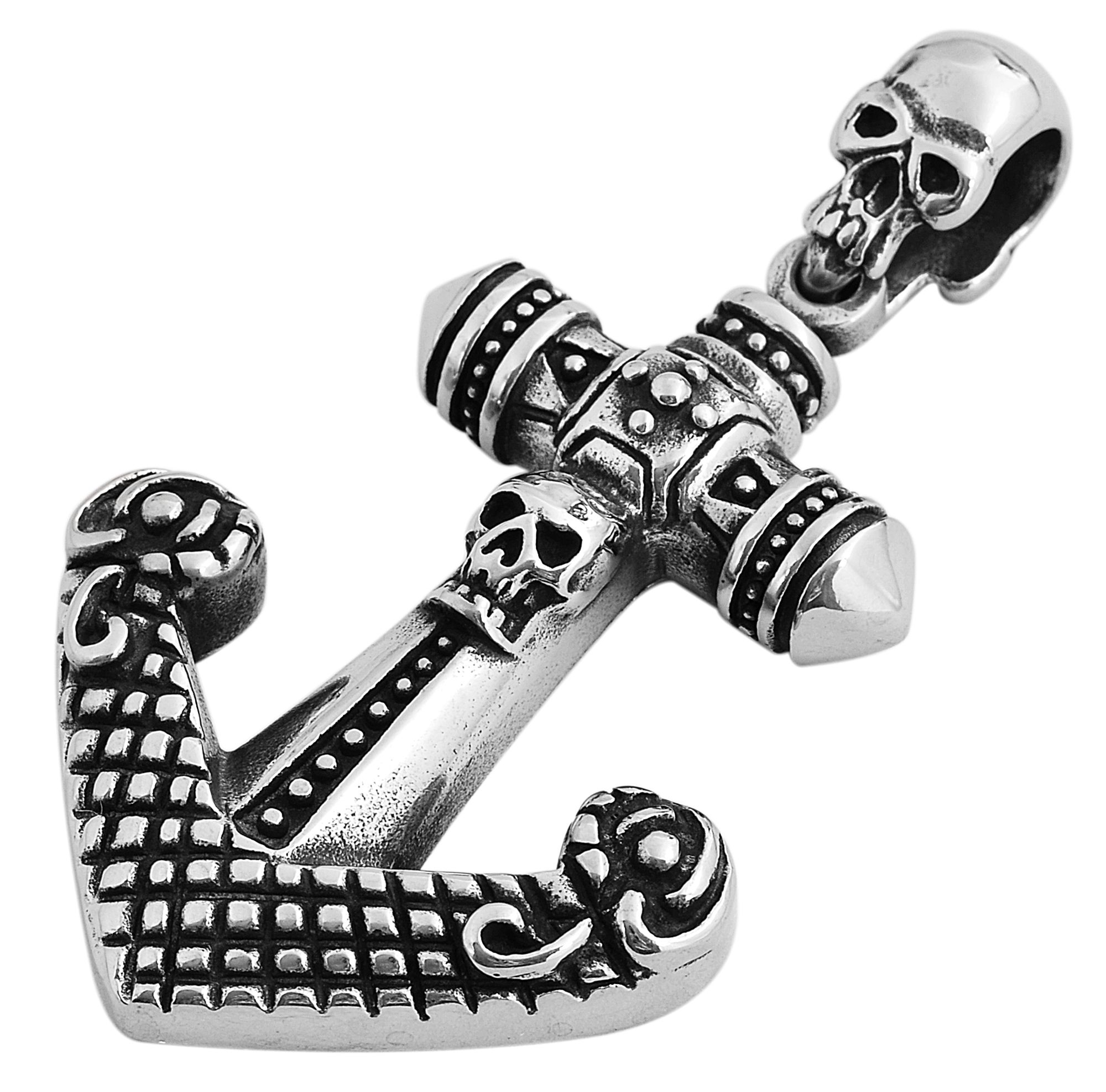 De hanger van het merk Akzent in de vorm van een anker is gemaakt van roestvrij staal en is licht gezwart en hoogglans gepolijst, wat hem een opvallende look geeft. Een ander kenmerk van de hanger is de versiering met schedels, die vooral opvalt aan het oogje. Dankzij de grote opening van het oogje kan de hanger aan kettingen van elke dikte worden bevestigd. Het oogje is 16 mm lang, 12 mm breed en heeft een dikte van 2,5 mm. De hanger is 36 mm breed, 52 mm lang en 8,5 mm dik (totale lengte met oogje 6,4 cm).
